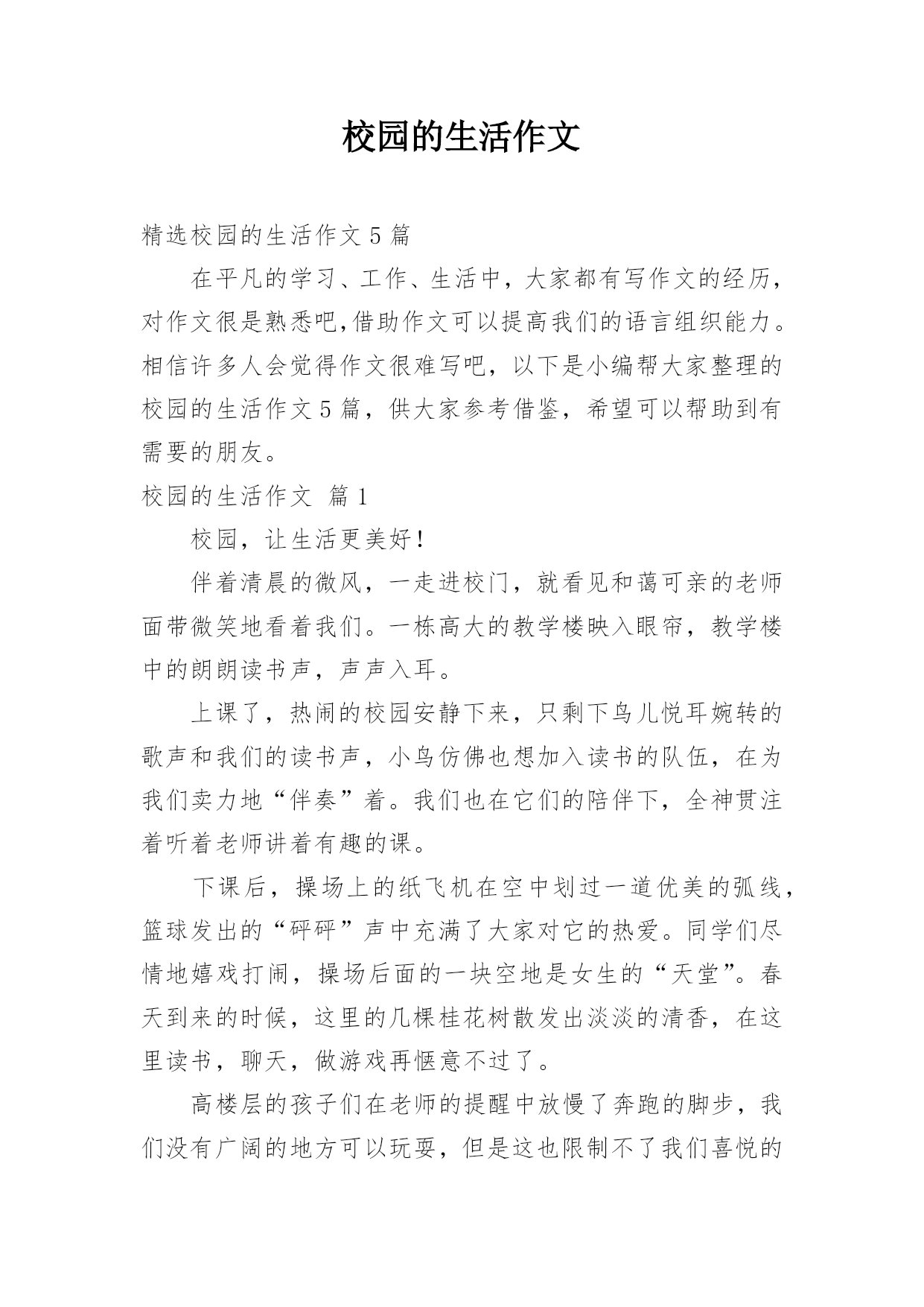 校园的生活作文精选校园的生活作文5篇在平凡的学习、工作、生活中,大家都有写作文的经历,对作文很是熟悉吧,借助作文可以提高我们的语言组织能力。相信许多人会觉得作文很难写吧,以下是小编帮大家整理的校园的生活作文5篇,供大家参考借鉴,希望可以帮助到有需要的朋友。校园的生活作文篇1校园,让生活更美好!伴着清晨的微风,一走进校门,就看见和蔼可亲的老师面带微笑地看着我们。一栋高大的教学楼映入眼帘,教学楼中的朗朗读书声,声声入耳。上课了,热闹的校园安静下来,只剩下鸟儿悦耳婉转的歌声和我们的读书声,小鸟仿佛也想加入读书的