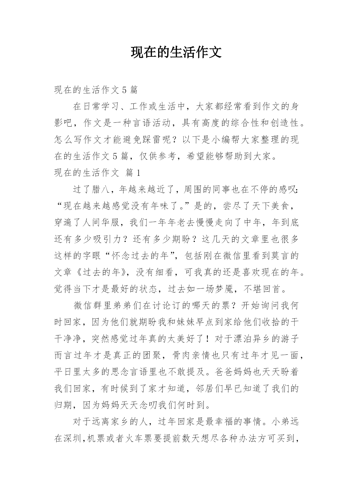 现在的生活作文现在的生活作文5篇在日常学习、工作或生活中,大家都经常看到作文的身影吧,作文是一种言语活动,具有高度的综合性和创造性。怎么写作文才能避免踩雷呢?以下是小编帮大家整理的现在的生活作文5篇,仅供参考,希望能够帮助到大家。现在的生活作文篇1过了腊八,年越来越近了,周围的同事也在不停的感叹:“现在越来越感觉没有年味了。”是的,尝尽了天下美食,穿遍了人间华服,我们一年年老去慢慢走向了中年,年到底还有多少吸引力?还有多少期盼?这几天的文章里也很多这样的字眼“怀念过去的年”,包括刚在微信里看到莫言的文章《