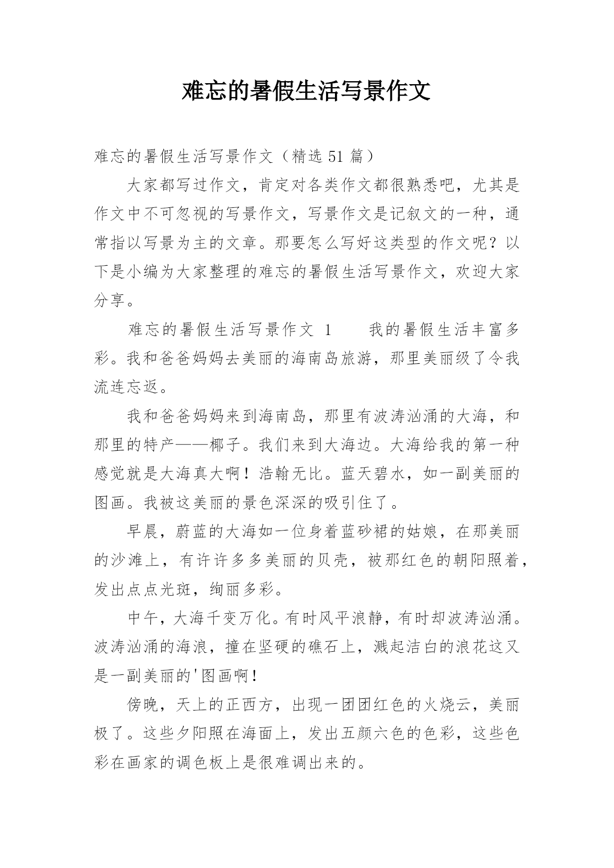 难忘的暑假生活写景作文难忘的暑假生活写景作文(精选51篇)大家都写过作文,肯定对各类作文都很熟悉吧,尤其是作文中不可忽视的写景作文,写景作文是记叙文的一种,通常指以写景为主的文章。那要怎么写好这类型的作文呢?以下是小编为大家整理的难忘的暑假生活写景作文,欢迎大家分享。难忘的暑假生活写景作文1我的暑假生活丰富多彩。我和爸爸妈妈去美丽的海南岛旅游,那里美丽级了令我流连忘返。我和爸爸妈妈来到海南岛,那里有波涛汹涌的大海,和那里的特产——椰子。我们来到大海边。大海给我的第一种感觉就是大海真大啊!浩翰无比。蓝天碧水