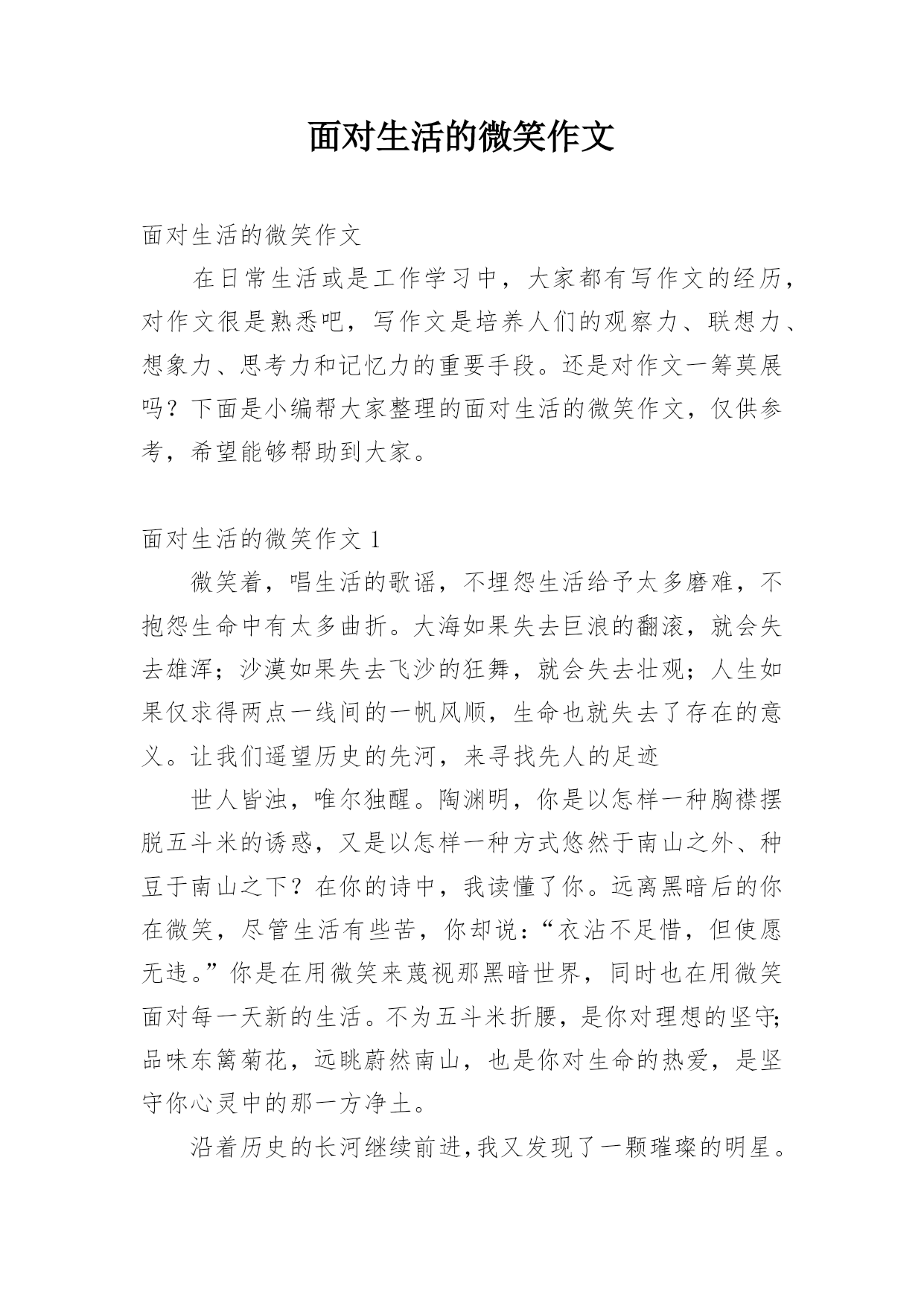 面对生活的微笑作文面对生活的微笑作文在日常生活或是工作学习中,大家都有写作文的经历,对作文很是熟悉吧,写作文是培养人们的观察力、联想力、想象力、思考力和记忆力的重要手段。还是对作文一筹莫展吗?下面是小编帮大家整理的面对生活的微笑作文,仅供参考,希望能够帮助到大家。面对生活的微笑作文1微笑着,唱生活的歌谣,不埋怨生活给予太多磨难,不抱怨生命中有太多曲折。大海如果失去巨浪的翻滚,就会失去雄浑;沙漠如果失去飞沙的狂舞,就会失去壮观;人生如果仅求得两点一线间的一帆风顺,生命也就失去了存在的意义。让我们遥望历史的先