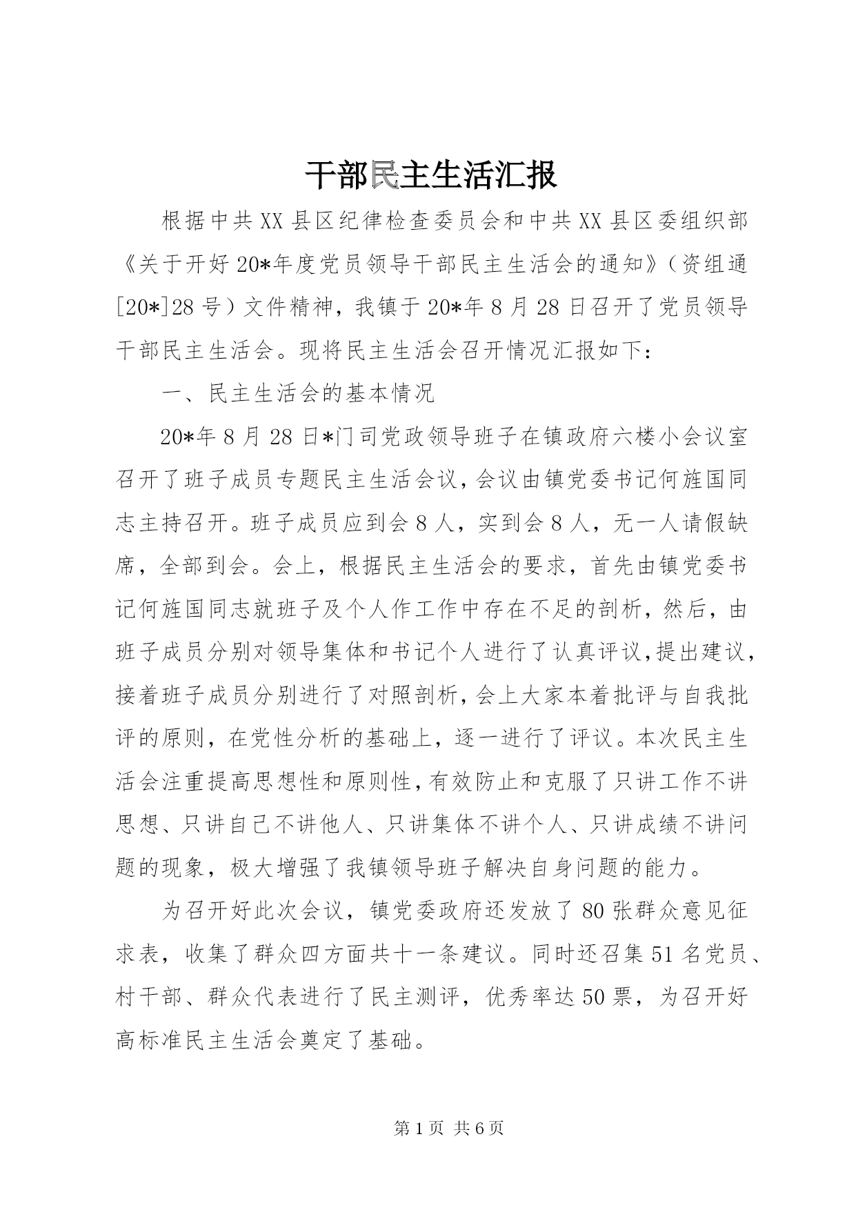 第PAGE\*Arabic\*MERGEFORMAT6页共NUMPAGES\*MERGEFORMAT6页干部民主生活汇报根据中共XX县区纪律检查委员会和中共XX县区委组织部《关于开好20*年度党员领导干部民主生活会的通知》(资组通[20*]28号)文件精神,我镇于20*年8月28日召开了党员领导干部民主生活会。现将民主生活会召开情况汇报如下:一、民主生活会的基本情况20*年8月28日*门司党政领导班子在镇政府六楼小会议室召开了班子成员专题民主生活会议,会议由镇党委书记何旌国同志主持召开。班子成