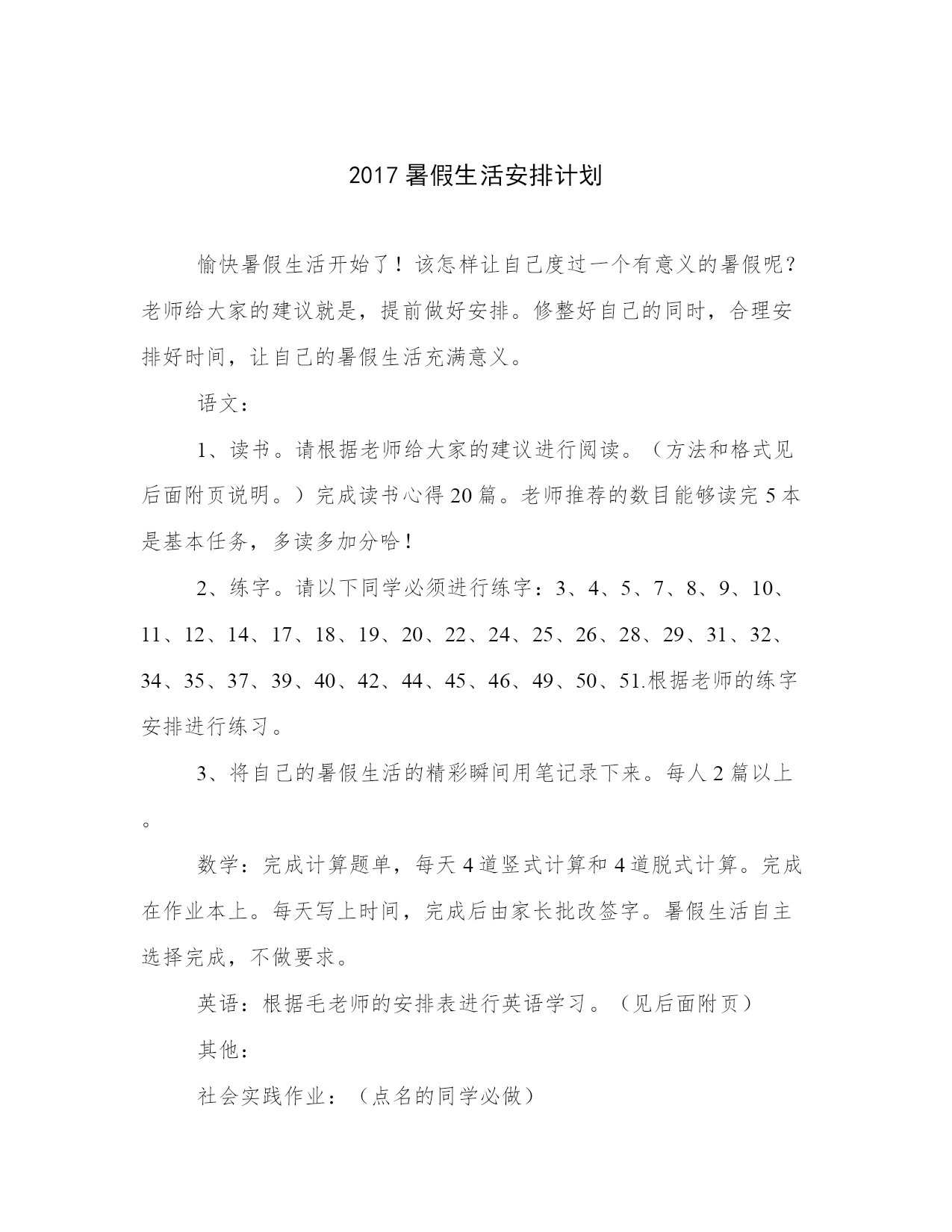 2017暑假生活安排计划愉快暑假生活开始了!该怎样让自己度过一个有意义的暑假呢?老师给大家的建议就是,提前做好安排。修整好自己的同时,合理安排好时间,让自己的暑假生活充满意义。语文:1、读书。请根据老师给大家的建议进行阅读。(方法和格式见后面附页说明。)完成读书心得20篇。老师推荐的数目能够读完5本是基本任务,多读多加分哈!2、练字。请以下同学必须进行练字:3、4、5、7、8、9、10、11、12、14、17、18、19、20、22、24、25、26、28、29、31、32、34、35、37、39、40、