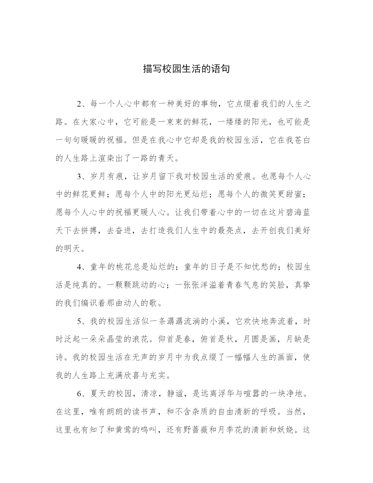 描写校园生活的语句2、每一个人心中都有一种美好的事物,它点缀着我们的人生之路。在大家心中,它可能是一束束的鲜花,一缕缕的阳光,也可能是一句句暖暖的祝福。但是在我心中它却是我的校园生活,它在我苍白的人生路上渲染出了一路的青天。3、岁月有痕,让岁月留下我对校园生活的爱痕。也愿每个人心中的鲜花更鲜;愿每个人中的阳光更灿烂;愿每个人的微笑更甜蜜;愿每个人心中的祝福更暖人心。让我们带着心中的一切在这片碧海蓝天下去拼搏,去奋进,去打造我们人生中的最亮点,去开创我们美好的明天。4、童年的桃花总是灿烂的;童年的日子是不知