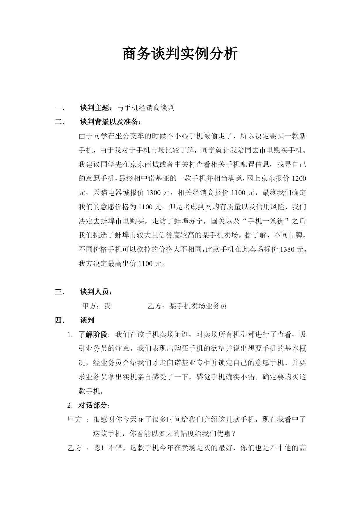 商务谈判实例分析谈判主题:与手机经销商谈判谈判背景以及准备:由于同学在坐公交车的时候不小心手机被偷走了,所以决定要买一款新手机,由于我对于手机市场比较了解,同学就让我陪同去市里购买手机。我建议同学先在京东商城或者中关村查看相关手机配置信息,找寻自己的意愿手机,最终相中诺基亚的一款手机并相当满意,网上京东报价1200元,天猫电器城报价1300元,相关经销商报价1100元,最终我们确定我们的意愿价格为1100元。但是考虑到网购有质量以及信用风险,我们决定去蚌埠市里购买。走访了蚌埠苏宁,国美以及“手机一条街”之