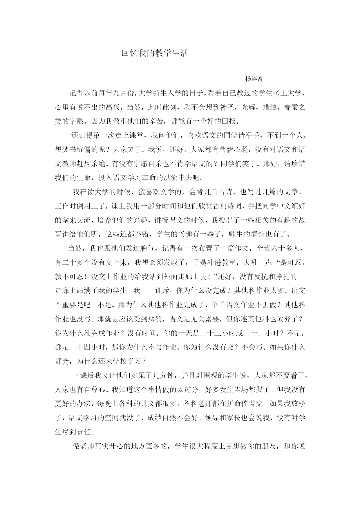 回忆我的教学生活杨连高记得以前每年九月份,大学新生入学的日子。看着自己教过的学生考上大学,心里有说不出的高兴。当然,此时此刻,我不会想到神圣,光辉,蜡烛,春蚕之类的字眼。因为我敬重他们的辛苦,都能有一个好的回报。还记得第一次走上课堂,我问他们,喜欢语文的同学请举手,不到十个人。想焚书坑儒的呢?大家笑了。我说,还好,大家都有菩萨心肠,没有对语文和语文教师赶尽杀绝。有没有宁愿自杀也不肯学语文的?同学们笑了。那好,请珍惜我们的生命,投入语文学习革命的洪流中去吧。我在读大学的时候,蛮喜欢文学的,会背几首古诗,也写