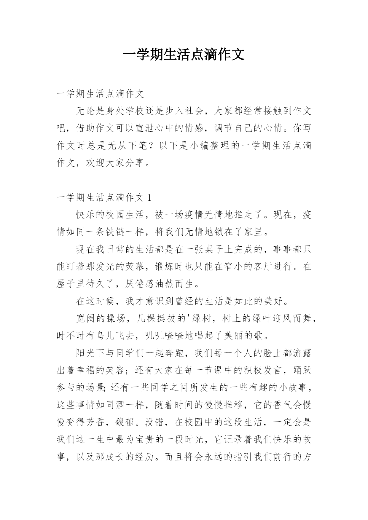 一学期生活点滴作文一学期生活点滴作文无论是身处学校还是步入社会,大家都经常接触到作文吧,借助作文可以宣泄心中的情感,调节自己的心情。你写作文时总是无从下笔?以下是小编整理的一学期生活点滴作文,欢迎大家分享。一学期生活点滴作文1快乐的校园生活,被一场疫情无情地推走了。现在,疫情如同一条铁链一样,将我们无情地锁在了家里。现在我日常的生活都是在一张桌子上完成的,事事都只能盯着那发光的荧幕,锻炼时也只能在窄小的客厅进行。在屋子里待久了,厌倦感油然而生。在这时候,我才意识到曾经的生活是如此的美好。宽阔的操场,几棵挺