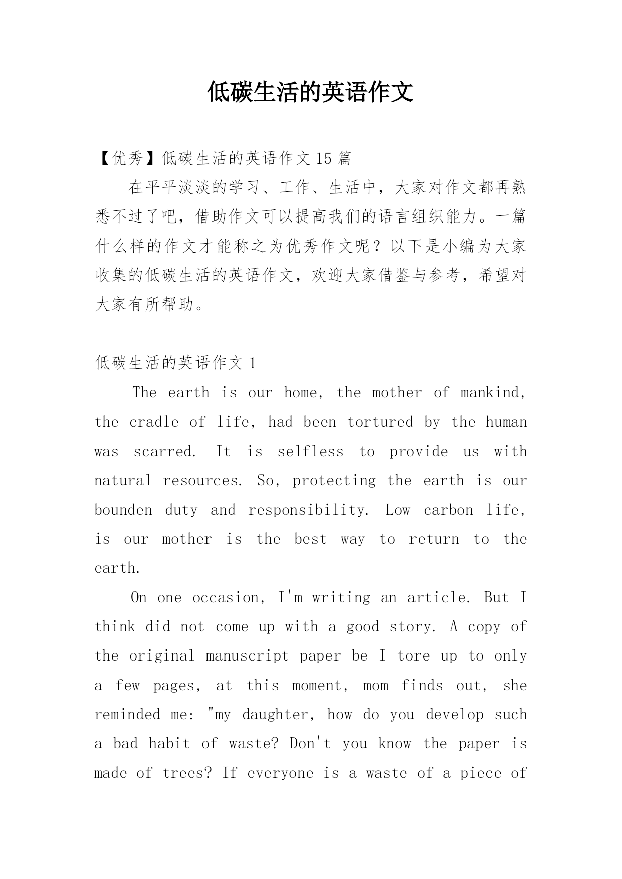 低碳生活的英语作文【优秀】低碳生活的英语作文15篇在平平淡淡的学习、工作、生活中,大家对作文都再熟悉不过了吧,借助作文可以提高我们的语言组织能力。一篇什么样的作文才能称之为优秀作文呢?以下是小编为大家收集的低碳生活的英语作文,欢迎大家借鉴与参考,希望对大家有所帮助。低碳生活的英语作文1Theearthisourhome,themotherofmankind,thecradleoflife,hadbeentorturedbythehumanwasscarred.Itisselflesstoprovideus