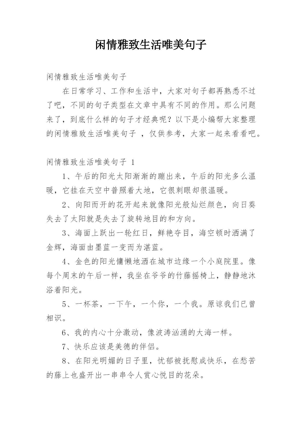 闲情雅致生活唯美句子闲情雅致生活唯美句子在日常学习、工作和生活中,大家对句子都再熟悉不过了吧,不同的句子类型在文章中具有不同的作用。那么问题来了,到底什么样的句子才经典呢?以下是小编帮大家整理的闲情雅致生活唯美句子,仅供参考,大家一起来看看吧。闲情雅致生活唯美句子11、午后的阳光太阳渐渐的蹦出来,午后的阳光多么温暖,它挂在天空中普照着大地,它很刺眼却很温暖。2、向阳而开的花开起来就像阳光般灿烂颜色,向日葵失去了太阳就是失去了旋转地目的和方向。3、海面上跃出一轮红日,鲜艳夺目,海空顿时洒满了金辉,海面由墨蓝