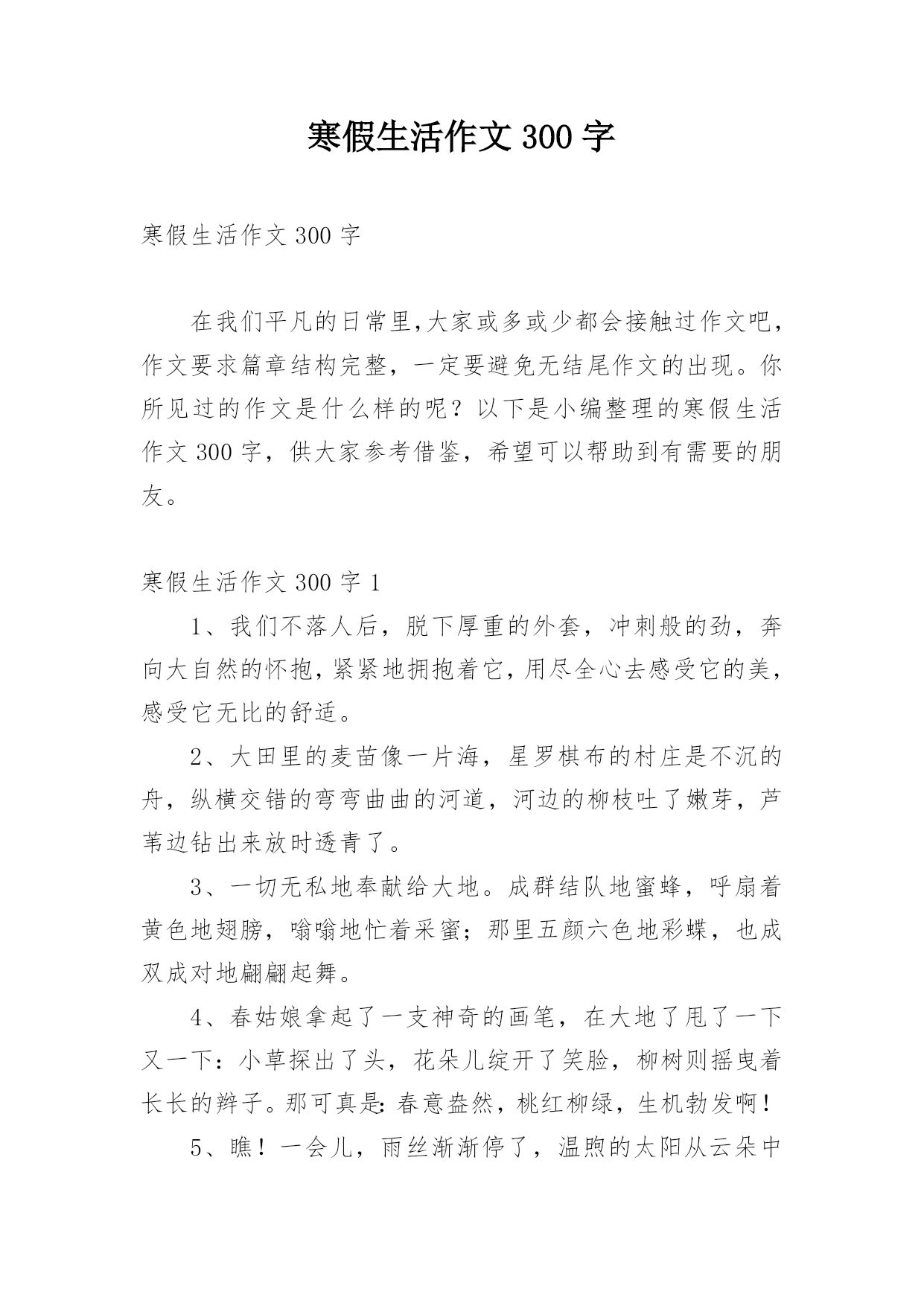 寒假生活作文300字寒假生活作文300字在我们平凡的日常里,大家或多或少都会接触过作文吧,作文要求篇章结构完整,一定要避免无结尾作文的出现。你所见过的作文是什么样的呢?以下是小编整理的寒假生活作文300字,供大家参考借鉴,希望可以帮助到有需要的朋友。寒假生活作文300字11、我们不落人后,脱下厚重的外套,冲刺般的劲,奔向大自然的怀抱,紧紧地拥抱着它,用尽全心去感受它的美,感受它无比的舒适。2、大田里的麦苗像一片海,星罗棋布的村庄是不沉的舟,纵横交错的弯弯曲曲的河道,河边的柳枝吐了嫩芽,芦苇边钻出来放时透青