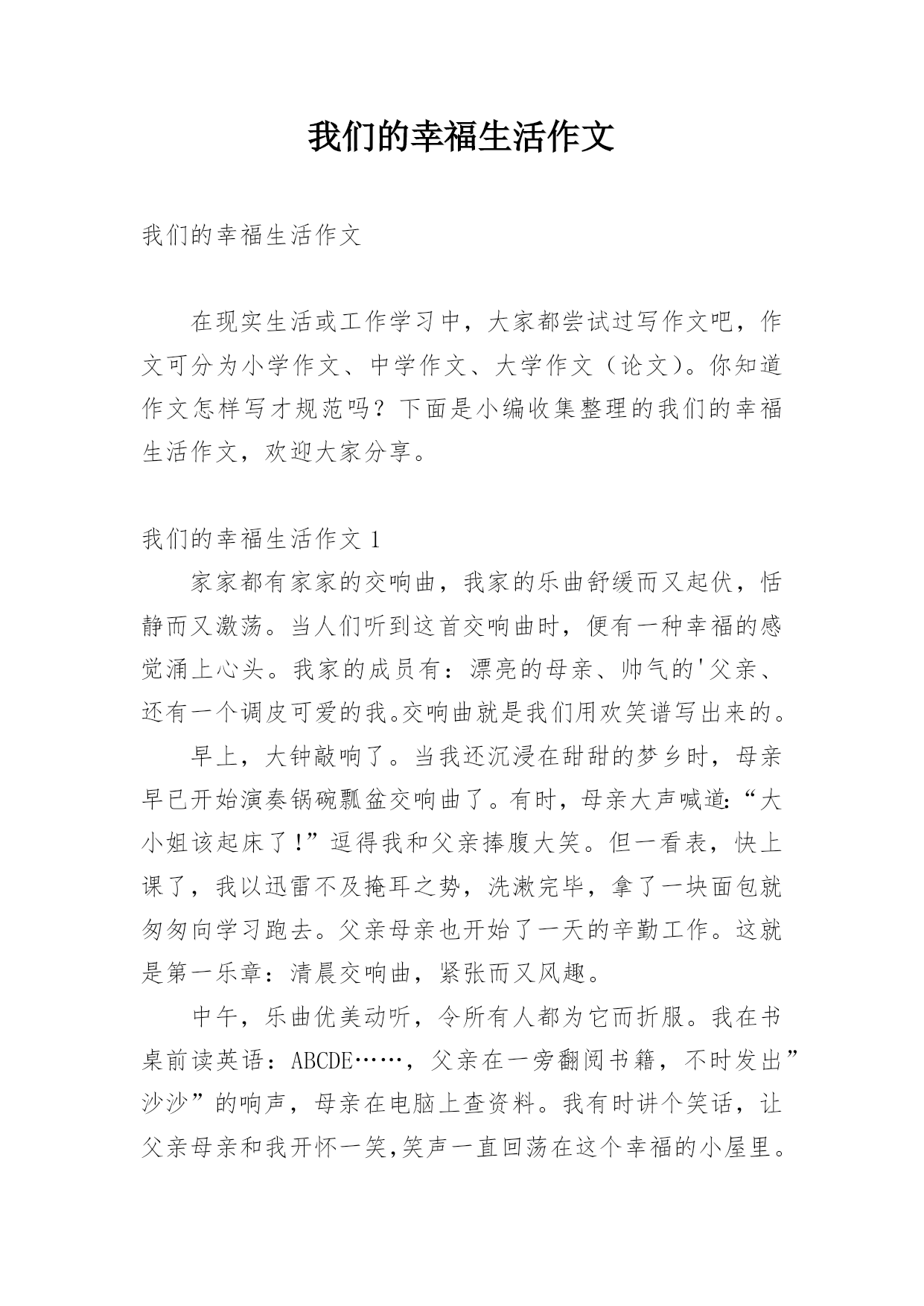 我们的幸福生活作文我们的幸福生活作文在现实生活或工作学习中,大家都尝试过写作文吧,作文可分为小学作文、中学作文、大学作文(论文)。你知道作文怎样写才规范吗?下面是小编收集整理的我们的幸福生活作文,欢迎大家分享。我们的幸福生活作文1家家都有家家的交响曲,我家的乐曲舒缓而又起伏,恬静而又激荡。当人们听到这首交响曲时,便有一种幸福的感觉涌上心头。我家的成员有:漂亮的母亲、帅气的'父亲、还有一个调皮可爱的我。交响曲就是我们用欢笑谱写出来的。早上,大钟敲响了。当我还沉浸在甜甜的梦乡时,母亲早已开始演奏锅碗瓢盆交响曲