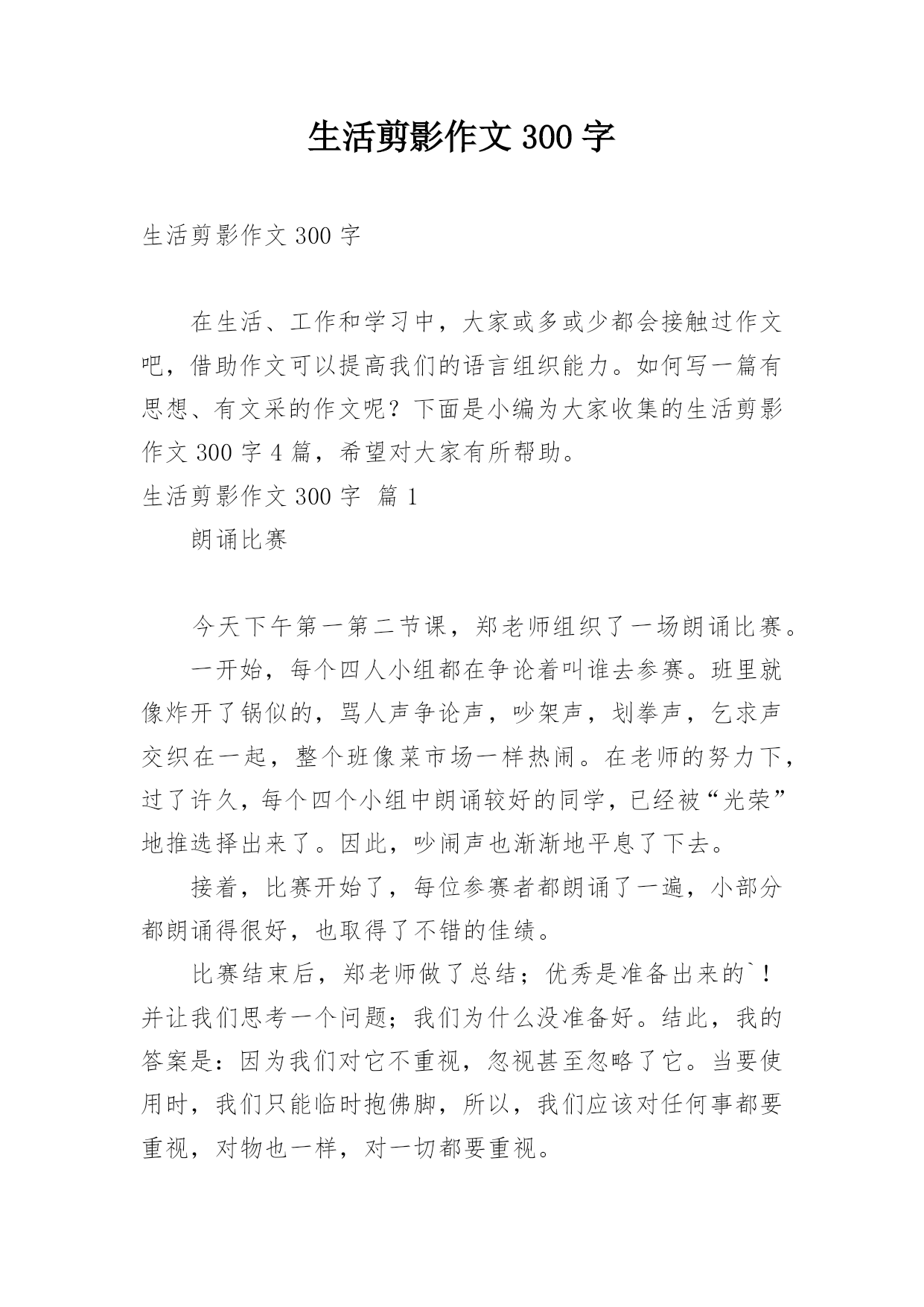 生活剪影作文300字生活剪影作文300字在生活、工作和学习中,大家或多或少都会接触过作文吧,借助作文可以提高我们的语言组织能力。如何写一篇有思想、有文采的作文呢?下面是小编为大家收集的生活剪影作文300字4篇,希望对大家有所帮助。生活剪影作文300字篇1朗诵比赛今天下午第一第二节课,郑老师组织了一场朗诵比赛。一开始,每个四人小组都在争论着叫谁去参赛。班里就像炸开了锅似的,骂人声争论声,吵架声,划拳声,乞求声交织在一起,整个班像菜市场一样热闹。在老师的努力下,过了许久,每个四个小组中朗诵较好的同学,已经被“