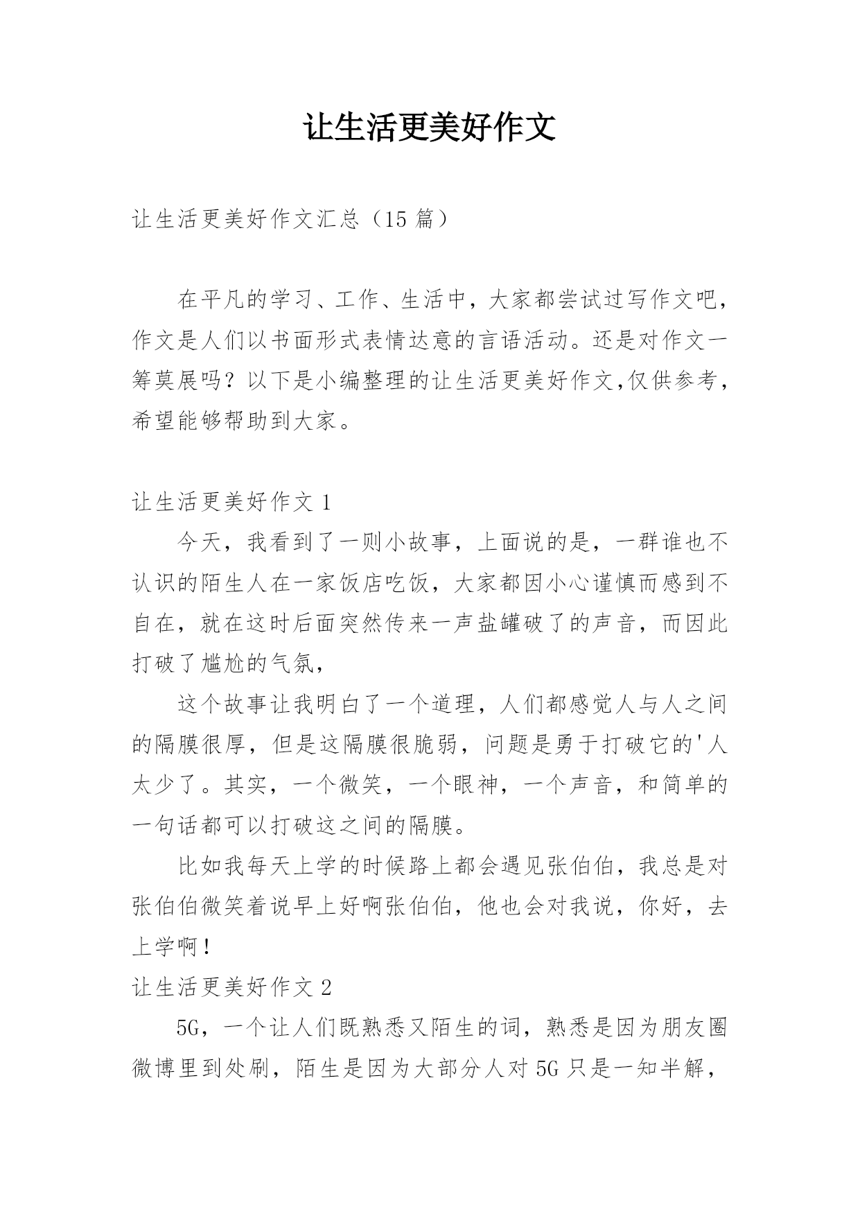 让生活更美好作文让生活更美好作文汇总(15篇)在平凡的学习、工作、生活中,大家都尝试过写作文吧,作文是人们以书面形式表情达意的言语活动。还是对作文一筹莫展吗?以下是小编整理的让生活更美好作文,仅供参考,希望能够帮助到大家。让生活更美好作文1今天,我看到了一则小故事,上面说的是,一群谁也不认识的陌生人在一家饭店吃饭,大家都因小心谨慎而感到不自在,就在这时后面突然传来一声盐罐破了的声音,而因此打破了尴尬的气氛,这个故事让我明白了一个道理,人们都感觉人与人之间的隔膜很厚,但是这隔膜很脆弱,问题是勇于打破它的'人
