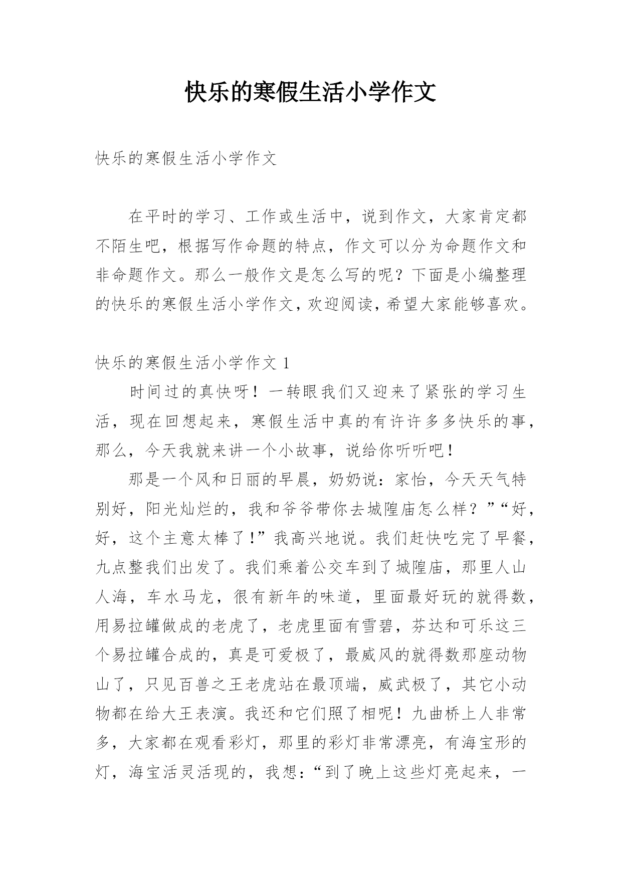 快乐的寒假生活小学作文快乐的寒假生活小学作文在平时的学习、工作或生活中,说到作文,大家肯定都不陌生吧,根据写作命题的特点,作文可以分为命题作文和非命题作文。那么一般作文是怎么写的呢?下面是小编整理的快乐的寒假生活小学作文,欢迎阅读,希望大家能够喜欢。快乐的寒假生活小学作文1时间过的真快呀!一转眼我们又迎来了紧张的学习生活,现在回想起来,寒假生活中真的有许许多多快乐的事,那么,今天我就来讲一个小故事,说给你听听吧!那是一个风和日丽的早晨,奶奶说:家怡,今天天气特别好,阳光灿烂的,我和爷爷带你去城隍庙怎么样?