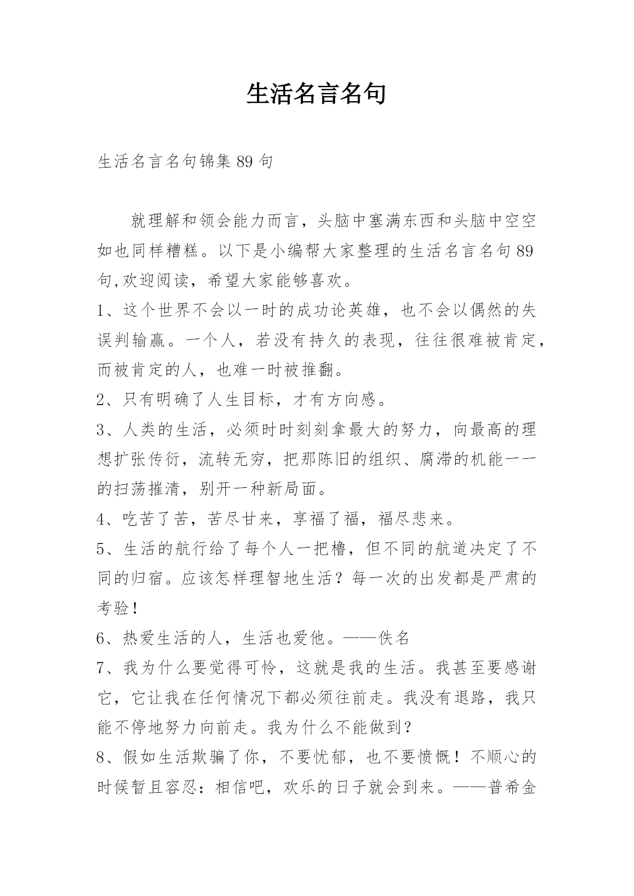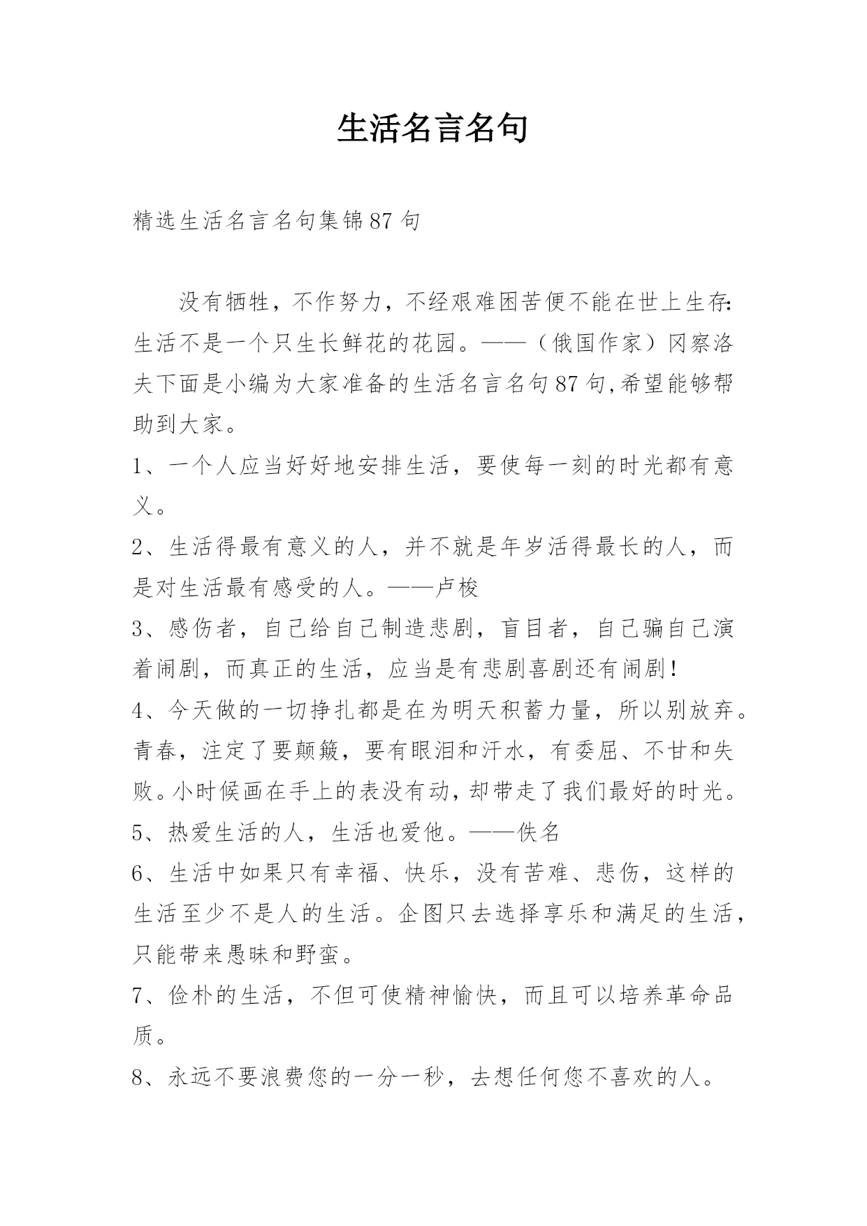 生活名言名句精选生活名言名句集锦87句没有牺牲,不作努力,不经艰难困苦便不能在世上生存:生活不是一个只生长鲜花的花园。——(俄国作家)冈察洛夫下面是小编为大家准备的生活名言名句87句,希望能够帮助到大家。1、一个人应当好好地安排生活,要使每一刻的时光都有意义。2、生活得最有意义的人,并不就是年岁活得最长的人,而是对生活最有感受的人。——卢梭3、感伤者,自己给自己制造悲剧,盲目者,自己骗自己演着闹剧,而真正的生活,应当是有悲剧喜剧还有闹剧!4、今天做的一切挣扎都是在为明天积蓄力量,所以别放弃。青春,注定了要