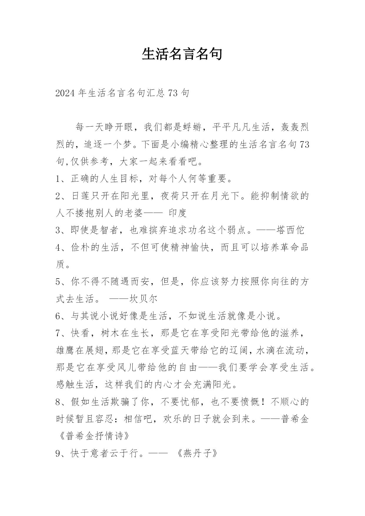 生活名言名句2024年生活名言名句汇总73句每一天睁开眼,我们都是蜉蝣,平平凡凡生活,轰轰烈烈的,追逐一个梦。下面是小编精心整理的生活名言名句73句,仅供参考,大家一起来看看吧。1、正确的人生目标,对每个人何等重要。2、日莲只开在阳光里,夜荷只开在月光下。能抑制情欲的人不搂抱别人的老婆——印度3、即使是智者,也难摈弃追求功名这个弱点。——塔西佗4、俭朴的生活,不但可使精神愉快,而且可以培养革命品质。5、你不得不随遇而安,但是,你应该努力按照你向往的方式去生活。——坎贝尔6、与其说小说好像是生活,不如说生活