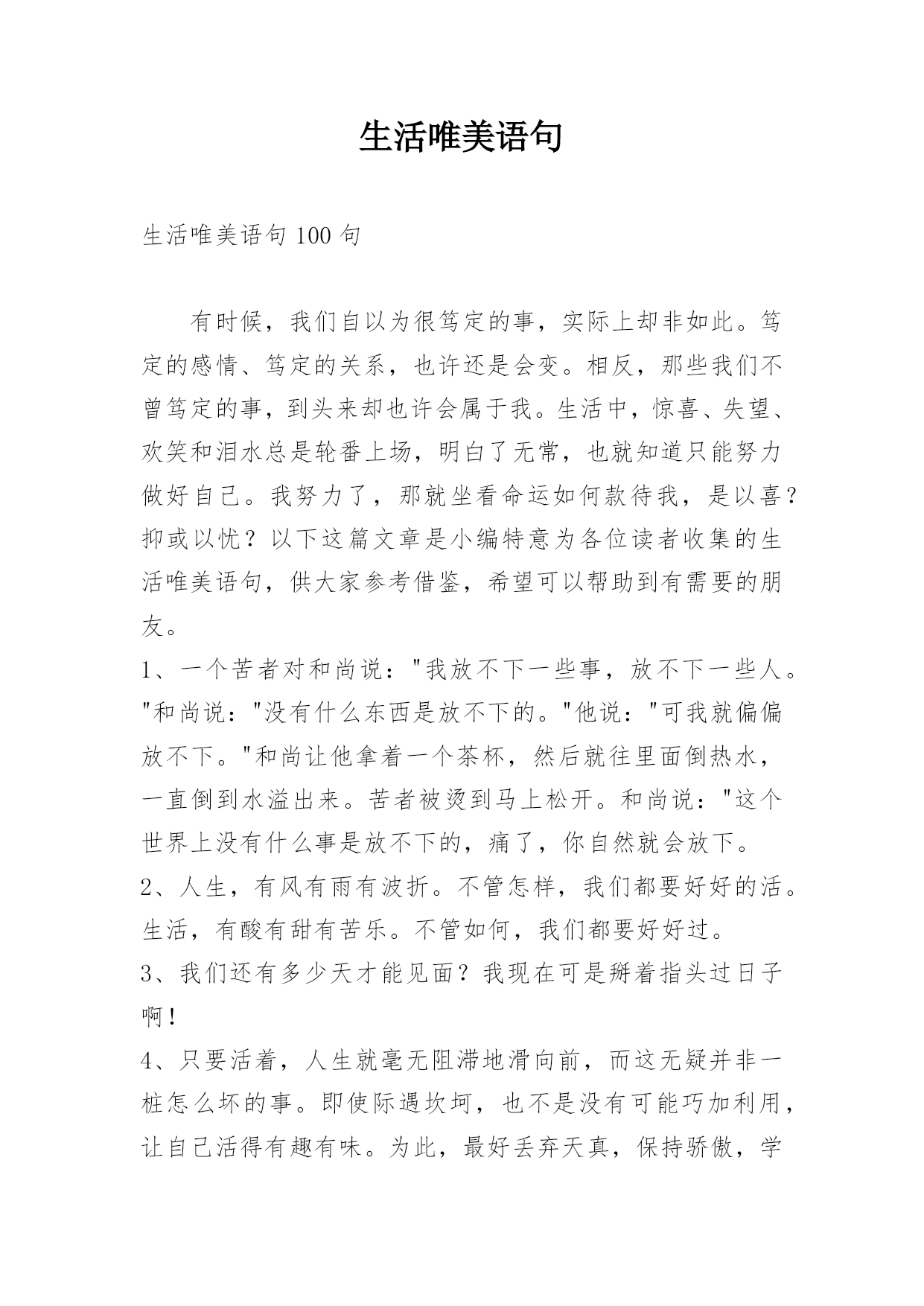 生活唯美语句生活唯美语句100句有时候,我们自以为很笃定的事,实际上却非如此。笃定的感情、笃定的关系,也许还是会变。相反,那些我们不曾笃定的事,到头来却也许会属于我。生活中,惊喜、失望、欢笑和泪水总是轮番上场,明白了无常,也就知道只能努力做好自己。我努力了,那就坐看命运如何款待我,是以喜?抑或以忧?以下这篇文章是小编特意为各位读者收集的生活唯美语句,供大家参考借鉴,希望可以帮助到有需要的朋友。1、一个苦者对和尚说:"我放不下一些事,放不下一些人。"和尚说:"没有什么东西是放不下的。"他说:"可我就偏偏放不