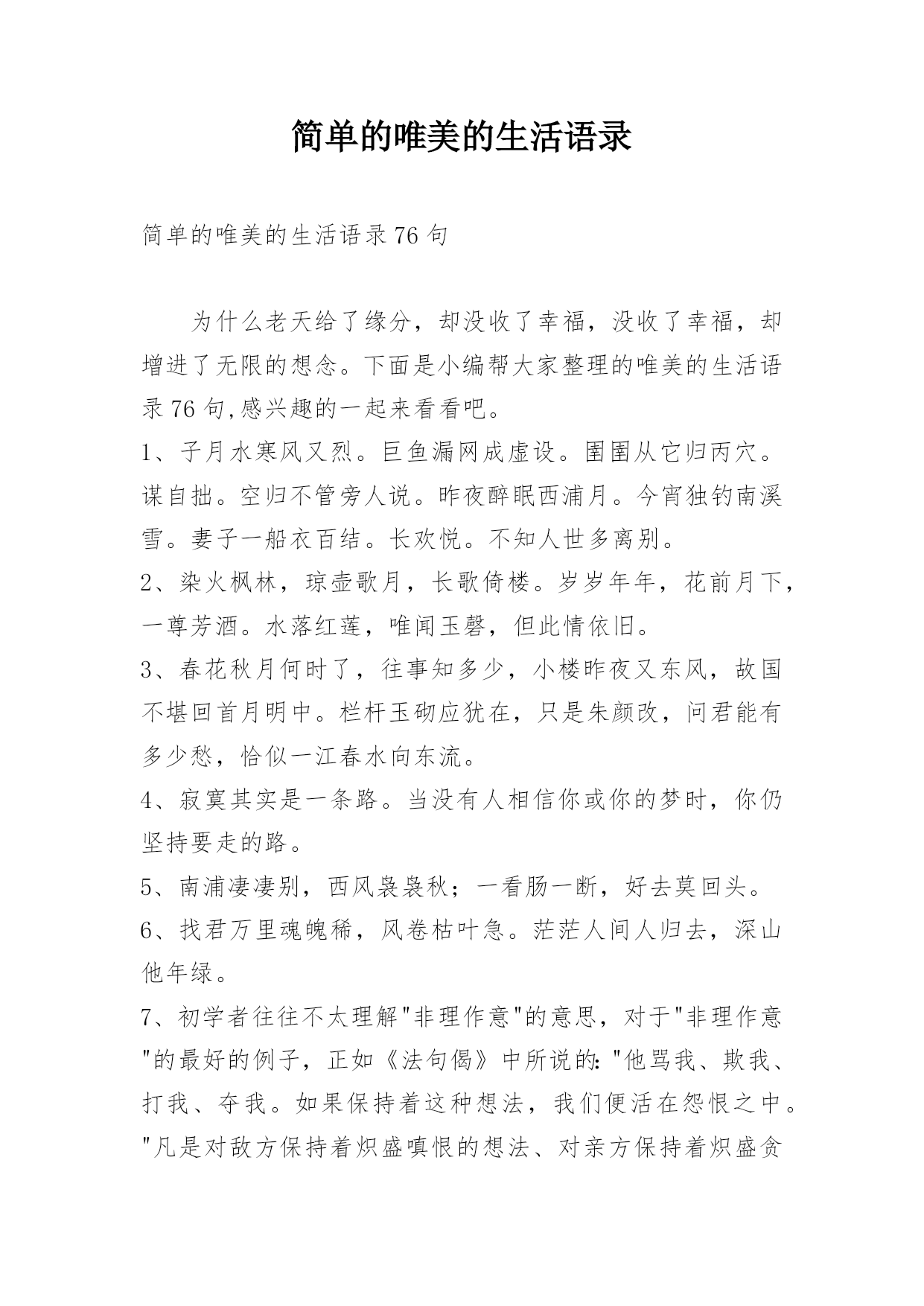 简单的唯美的生活语录简单的唯美的生活语录76句为什么老天给了缘分,却没收了幸福,没收了幸福,却增进了无限的想念。下面是小编帮大家整理的唯美的生活语录76句,感兴趣的一起来看看吧。1、子月水寒风又烈。巨鱼漏网成虚设。圉圉从它归丙穴。谋自拙。空归不管旁人说。昨夜醉眠西浦月。今宵独钓南溪雪。妻子一船衣百结。长欢悦。不知人世多离别。2、染火枫林,琼壶歌月,长歌倚楼。岁岁年年,花前月下,一尊芳酒。水落红莲,唯闻玉磬,但此情依旧。3、春花秋月何时了,往事知多少,小楼昨夜又东风,故国不堪回首月明中。栏杆玉砌应犹在,只是