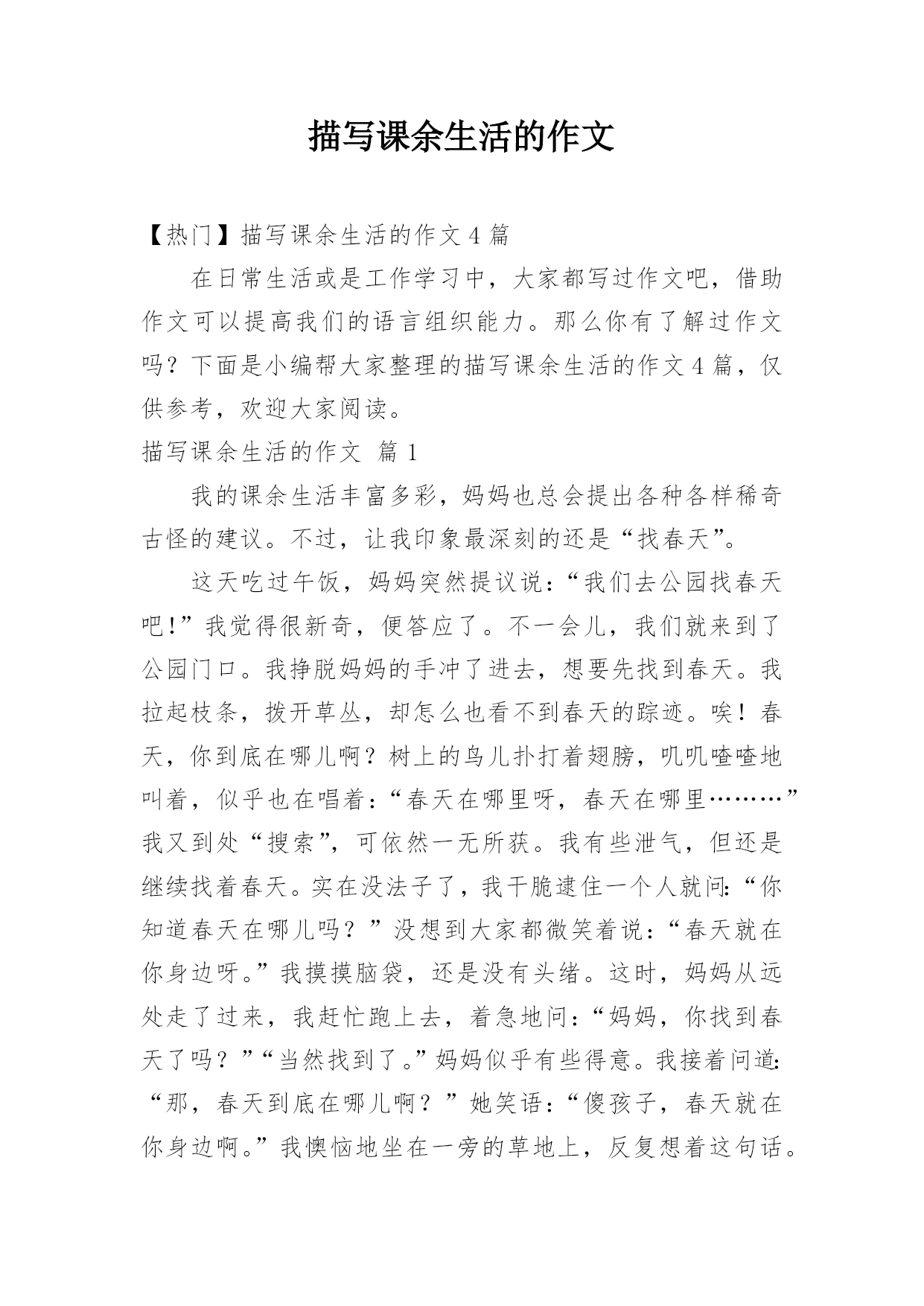描写课余生活的作文【热门】描写课余生活的作文4篇在日常生活或是工作学习中,大家都写过作文吧,借助作文可以提高我们的语言组织能力。那么你有了解过作文吗?下面是小编帮大家整理的描写课余生活的作文4篇,仅供参考,欢迎大家阅读。描写课余生活的作文篇1我的课余生活丰富多彩,妈妈也总会提出各种各样稀奇古怪的建议。不过,让我印象最深刻的还是“找春天”。这天吃过午饭,妈妈突然提议说:“我们去公园找春天吧!”我觉得很新奇,便答应了。不一会儿,我们就来到了公园门口。我挣脱妈妈的手冲了进去,想要先找到春天。我拉起枝条,拨开草丛