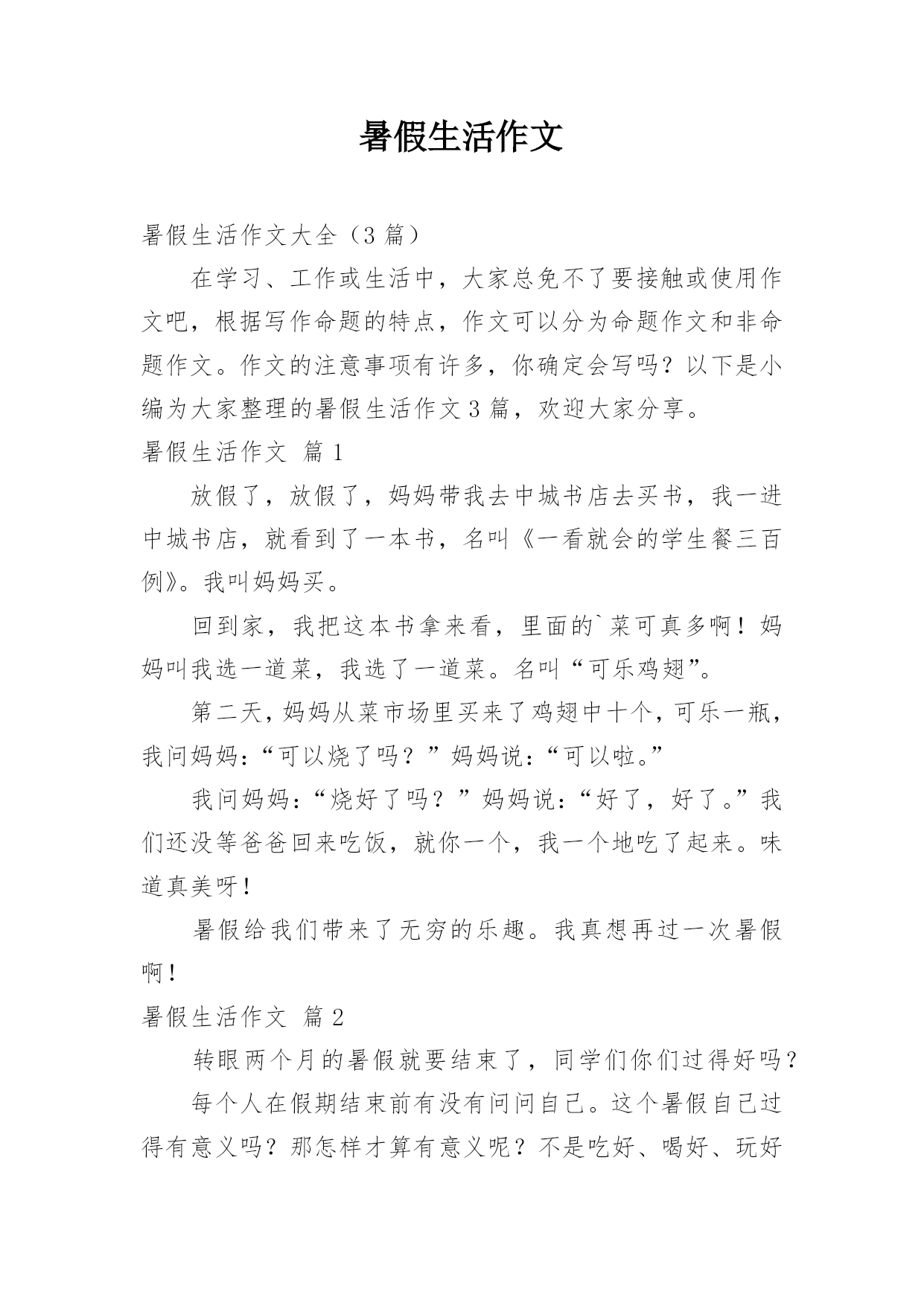 暑假生活作文暑假生活作文大全(3篇)在学习、工作或生活中,大家总免不了要接触或使用作文吧,根据写作命题的特点,作文可以分为命题作文和非命题作文。作文的注意事项有许多,你确定会写吗?以下是小编为大家整理的暑假生活作文3篇,欢迎大家分享。暑假生活作文篇1放假了,放假了,妈妈带我去中城书店去买书,我一进中城书店,就看到了一本书,名叫《一看就会的学生餐三百例》。我叫妈妈买。回到家,我把这本书拿来看,里面的`菜可真多啊!妈妈叫我选一道菜,我选了一道菜。名叫“可乐鸡翅”。第二天,妈妈从菜市场里买来了鸡翅中十个,可乐一