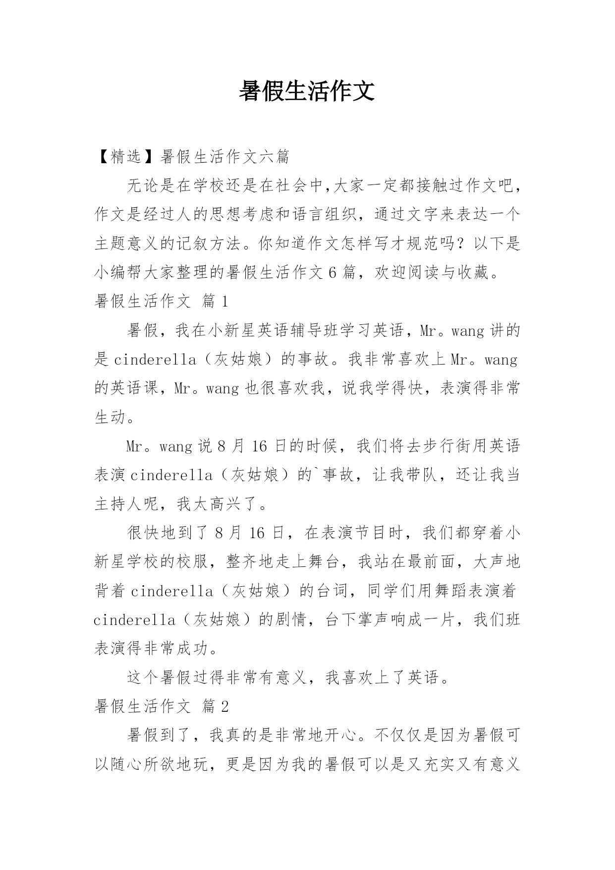 暑假生活作文【精选】暑假生活作文六篇无论是在学校还是在社会中,大家一定都接触过作文吧,作文是经过人的思想考虑和语言组织,通过文字来表达一个主题意义的记叙方法。你知道作文怎样写才规范吗?以下是小编帮大家整理的暑假生活作文6篇,欢迎阅读与收藏。暑假生活作文篇1暑假,我在小新星英语辅导班学习英语,Mr。wang讲的是cinderella(灰姑娘)的事故。我非常喜欢上Mr。wang的英语课,Mr。wang也很喜欢我,说我学得快,表演得非常生动。Mr。wang说8月16日的时候,我们将去步行街用英语表演cinder