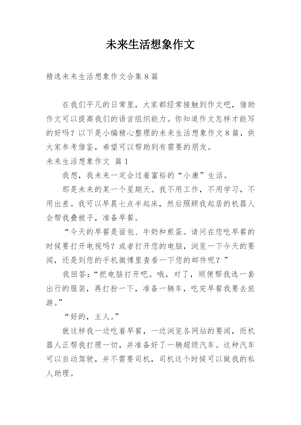 未来生活想象作文精选未来生活想象作文合集8篇在我们平凡的日常里,大家都经常接触到作文吧,借助作文可以提高我们的语言组织能力。你知道作文怎样才能写的好吗?以下是小编精心整理的未来生活想象作文8篇,供大家参考借鉴,希望可以帮助到有需要的朋友。未来生活想象作文篇1我想,我未来一定会过着富裕的“小康”生活。那是未来的某一个星期天。我不用工作,不用学习,不用出差。我可以早晨七点半起床,然后照顾我起居的机器人会帮我叠被子,准备早餐。“今天的早餐是面包、牛奶和煎蛋。请问在您吃早餐的时候要打开电视吗?或者打开您的电脑,浏