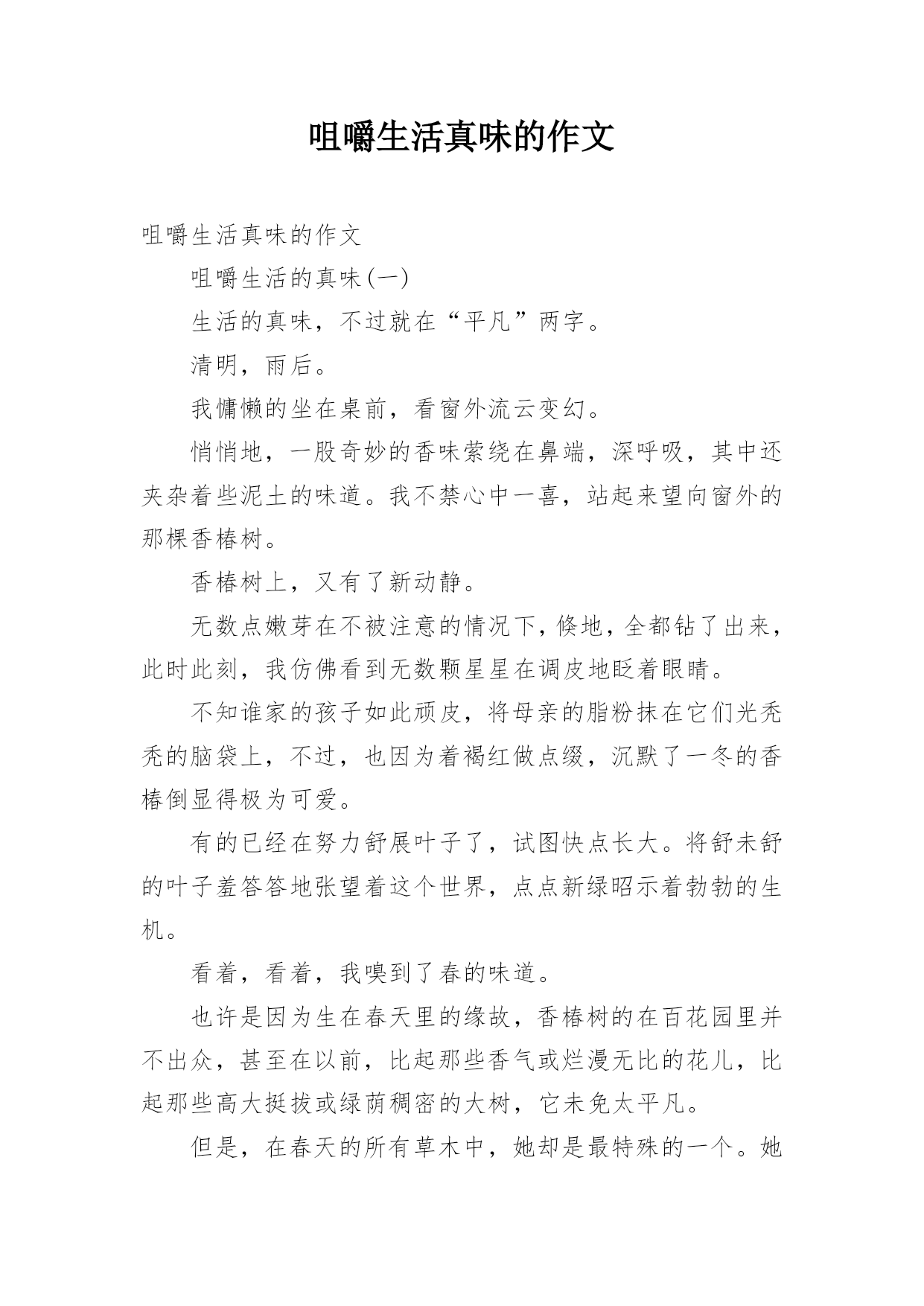 咀嚼生活真味的作文咀嚼生活真味的作文咀嚼生活的真味(一)生活的真味,不过就在“平凡”两字。清明,雨后。我慵懒的坐在桌前,看窗外流云变幻。悄悄地,一股奇妙的香味萦绕在鼻端,深呼吸,其中还夹杂着些泥土的味道。我不禁心中一喜,站起来望向窗外的那棵香椿树。香椿树上,又有了新动静。无数点嫩芽在不被注意的情况下,倏地,全都钻了出来,此时此刻,我仿佛看到无数颗星星在调皮地眨着眼睛。不知谁家的孩子如此顽皮,将母亲的脂粉抹在它们光秃秃的脑袋上,不过,也因为着褐红做点缀,沉默了一冬的香椿倒显得极为可爱。有的已经在努力舒展叶子