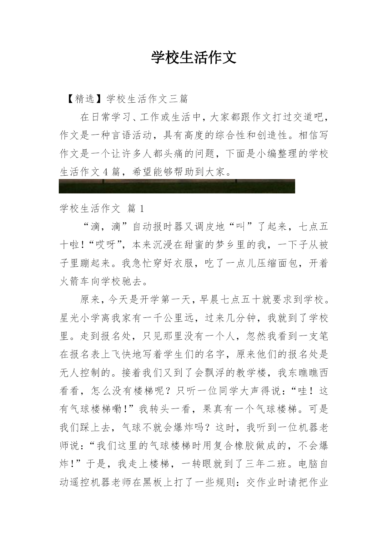 学校生活作文【精选】学校生活作文三篇在日常学习、工作或生活中,大家都跟作文打过交道吧,作文是一种言语活动,具有高度的综合性和创造性。相信写作文是一个让许多人都头痛的问题,下面是小编整理的学校生活作文4篇,希望能够帮助到大家。学校生活作文篇1“滴,滴”自动报时器又调皮地“叫”了起来,七点五十啦!“哎呀”,本来沉浸在甜蜜的梦乡里的我,一下子从被子里蹦起来。我急忙穿好衣服,吃了一点儿压缩面包,开着火箭车向学校驰去。原来,今天是开学第一天,早晨七点五十就要求到学校。星光小学离我家有一千公里远,过来几分钟,我就到了