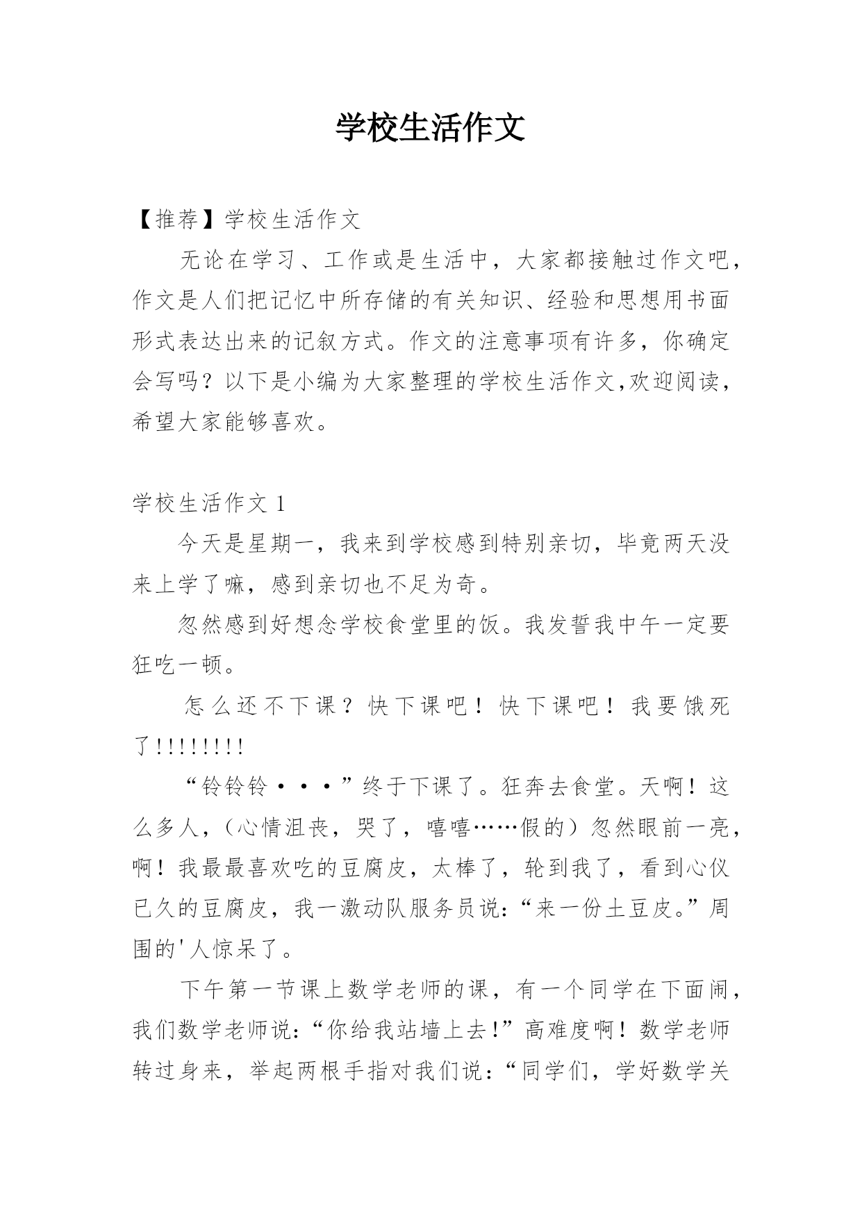 学校生活作文【推荐】学校生活作文无论在学习、工作或是生活中,大家都接触过作文吧,作文是人们把记忆中所存储的有关知识、经验和思想用书面形式表达出来的记叙方式。作文的注意事项有许多,你确定会写吗?以下是小编为大家整理的学校生活作文,欢迎阅读,希望大家能够喜欢。学校生活作文1今天是星期一,我来到学校感到特别亲切,毕竟两天没来上学了嘛,感到亲切也不足为奇。忽然感到好想念学校食堂里的饭。我发誓我中午一定要狂吃一顿。怎么还不下课?快下课吧!快下课吧!我要饿死了!!!!!!!!“铃铃铃···”终于下课了。狂奔去食堂。天