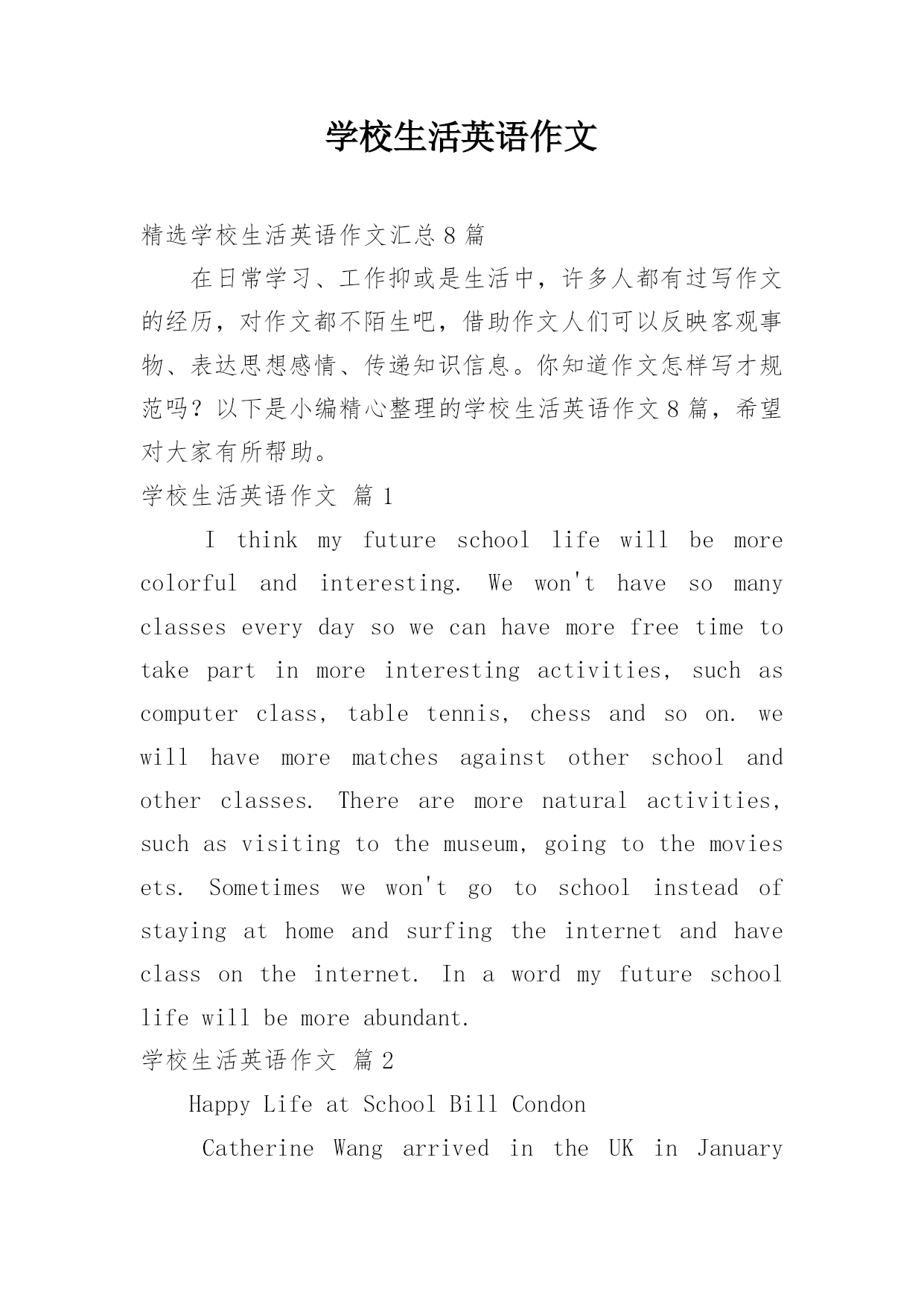 学校生活英语作文精选学校生活英语作文汇总8篇在日常学习、工作抑或是生活中,许多人都有过写作文的经历,对作文都不陌生吧,借助作文人们可以反映客观事物、表达思想感情、传递知识信息。你知道作文怎样写才规范吗?以下是小编精心整理的学校生活英语作文8篇,希望对大家有所帮助。学校生活英语作文篇1Ithinkmyfutureschoollifewillbemorecolorfulandinteresting.Wewon'thavesomanyclasseseverydaysowecanhavemorefreetimet