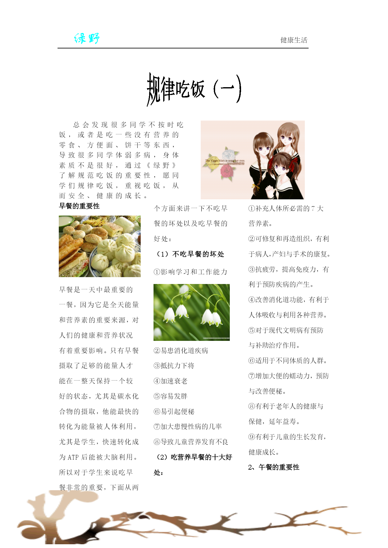 绿野健康生活总会发现很多同学不按时吃饭,或者是吃一些没有营养的零食、方便面、饼干等东西,导致很多同学体弱多病,身体素质不是很好,通过《绿野》了解规范吃饭的重要性,愿同学们规律吃饭,重视吃饭,从而安全、健康的成长。早餐的重要性早餐是一天中最重要的一餐,因为它是全天能量和营养素的重要来源,对人们的健康和营养状况有着重要影响。只有早餐摄取了足够的能量人才能在一整天保持一个较好的状态,尤其是碳水化合物的摄取,他能最快的转化为能量被人体利用,尤其是学生,快速转化成为ATP后能被大脑利用。所以对于学生来说吃早餐非常的