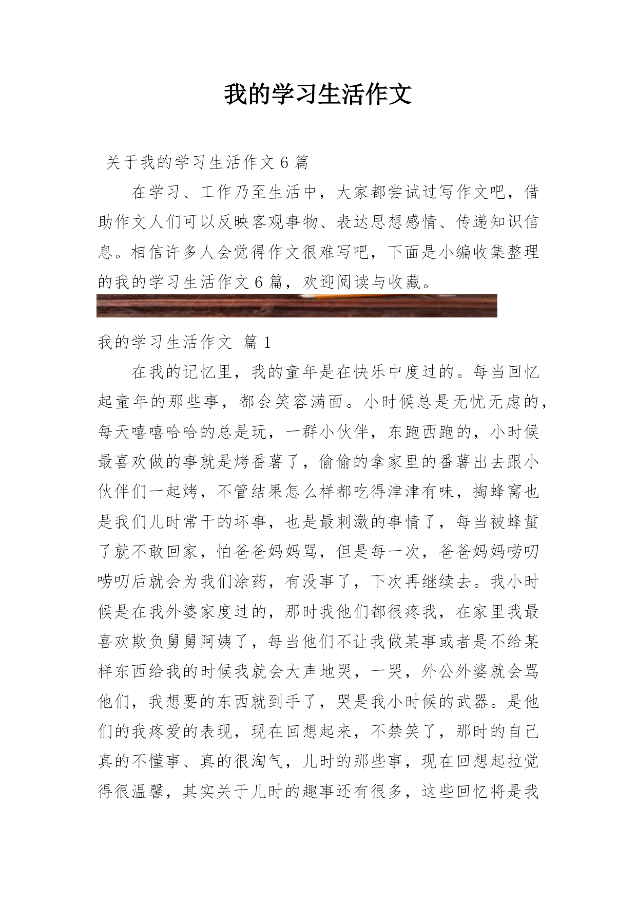 我的学习生活作文关于我的学习生活作文6篇在学习、工作乃至生活中,大家都尝试过写作文吧,借助作文人们可以反映客观事物、表达思想感情、传递知识信息。相信许多人会觉得作文很难写吧,下面是小编收集整理的我的学习生活作文6篇,欢迎阅读与收藏。我的学习生活作文篇1在我的记忆里,我的童年是在快乐中度过的。每当回忆起童年的那些事,都会笑容满面。小时候总是无忧无虑的,每天嘻嘻哈哈的总是玩,一群小伙伴,东跑西跑的,小时候最喜欢做的事就是烤番薯了,偷偷的拿家里的番薯出去跟小伙伴们一起烤,不管结果怎么样都吃得津津有味,掏蜂窝也是