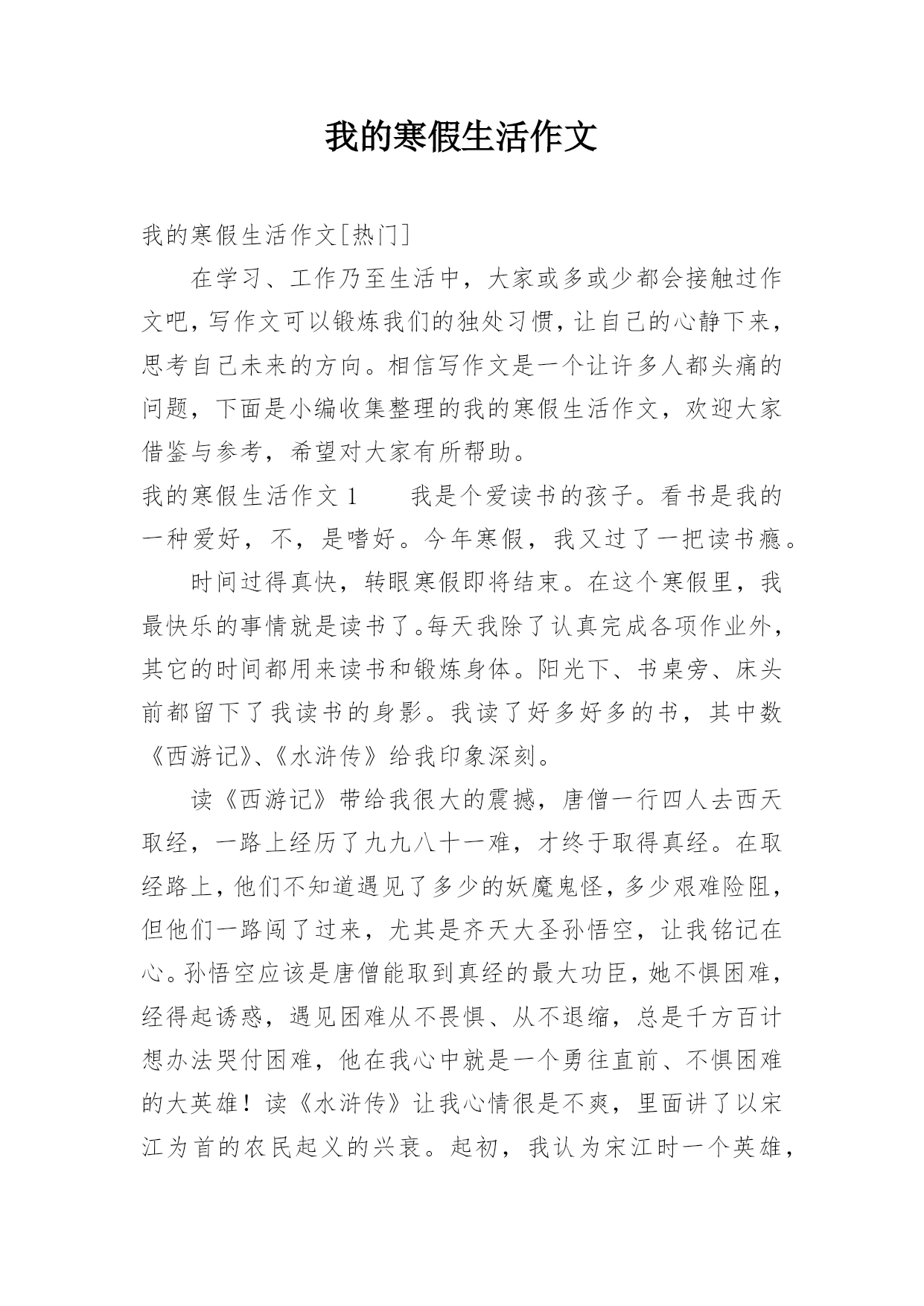 我的寒假生活作文我的寒假生活作文[热门]在学习、工作乃至生活中,大家或多或少都会接触过作文吧,写作文可以锻炼我们的独处习惯,让自己的心静下来,思考自己未来的方向。相信写作文是一个让许多人都头痛的问题,下面是小编收集整理的我的寒假生活作文,欢迎大家借鉴与参考,希望对大家有所帮助。我的寒假生活作文1我是个爱读书的孩子。看书是我的一种爱好,不,是嗜好。今年寒假,我又过了一把读书瘾。时间过得真快,转眼寒假即将结束。在这个寒假里,我最快乐的事情就是读书了。每天我除了认真完成各项作业外,其它的时间都用来读书和锻炼身体