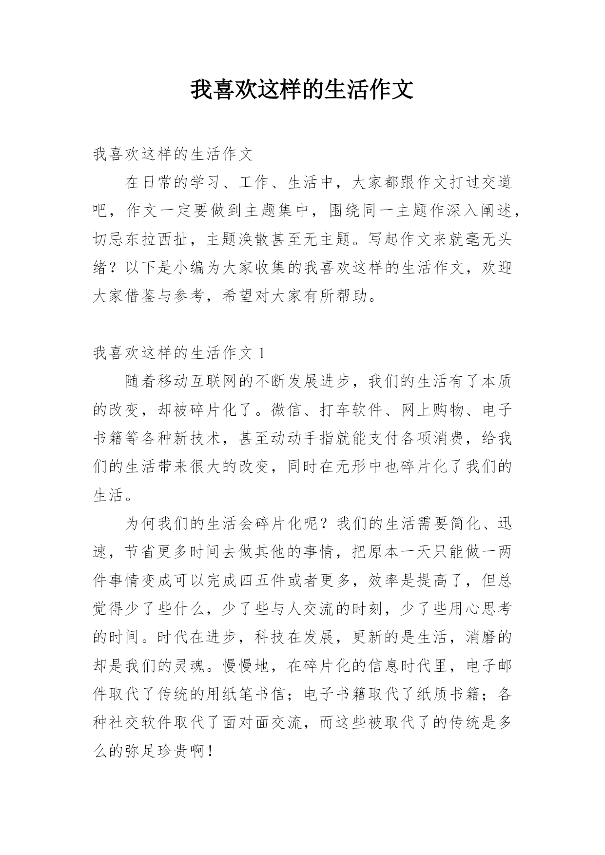 我喜欢这样的生活作文我喜欢这样的生活作文在日常的学习、工作、生活中,大家都跟作文打过交道吧,作文一定要做到主题集中,围绕同一主题作深入阐述,切忌东拉西扯,主题涣散甚至无主题。写起作文来就毫无头绪?以下是小编为大家收集的我喜欢这样的生活作文,欢迎大家借鉴与参考,希望对大家有所帮助。我喜欢这样的生活作文1随着移动互联网的不断发展进步,我们的生活有了本质的改变,却被碎片化了。微信、打车软件、网上购物、电子书籍等各种新技术,甚至动动手指就能支付各项消费,给我们的生活带来很大的改变,同时在无形中也碎片化了我们的生活