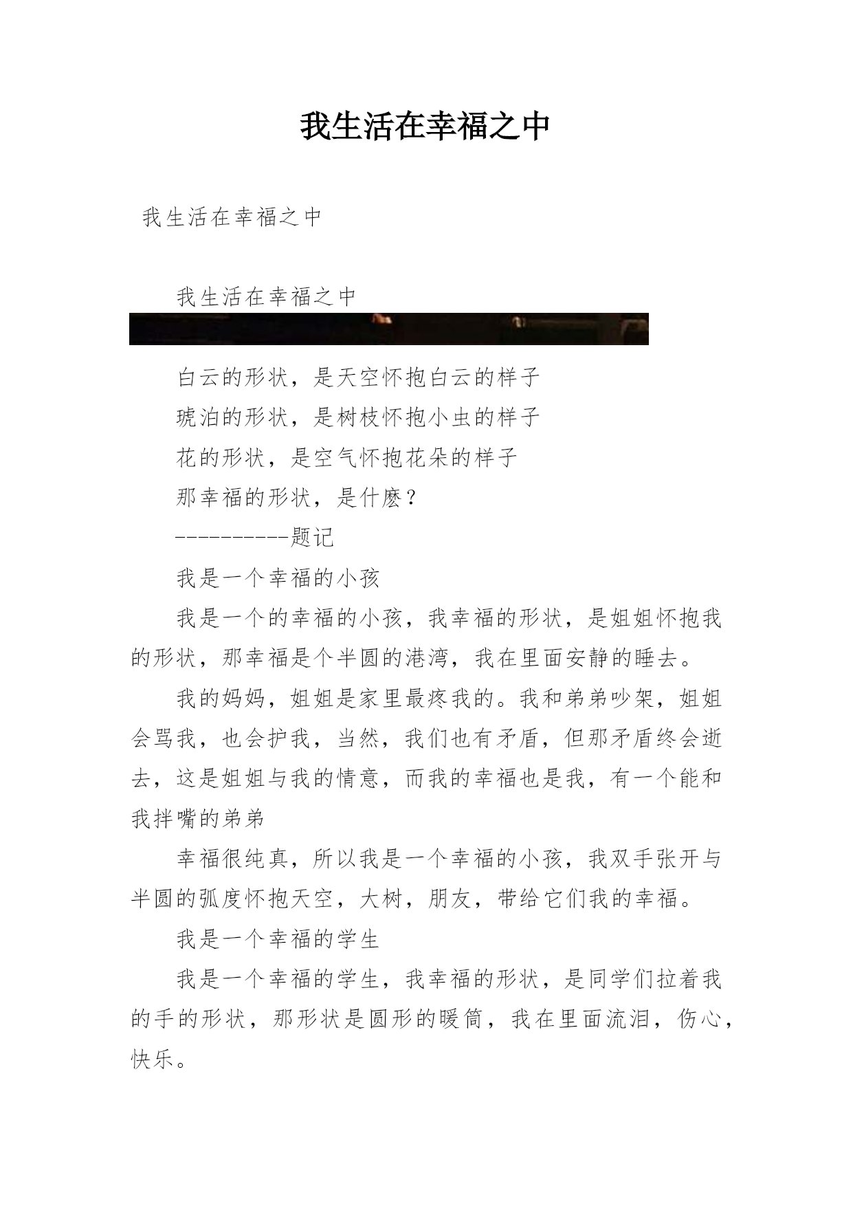 我生活在幸福之中我生活在幸福之中我生活在幸福之中白云的形状,是天空怀抱白云的样子琥泊的形状,是树枝怀抱小虫的样子花的形状,是空气怀抱花朵的样子那幸福的形状,是什麽?----------题记我是一个幸福的小孩我是一个的幸福的小孩,我幸福的形状,是姐姐怀抱我的形状,那幸福是个半圆的港湾,我在里面安静的睡去。我的妈妈,姐姐是家里最疼我的。我和弟弟吵架,姐姐会骂我,也会护我,当然,我们也有矛盾,但那矛盾终会逝去,这是姐姐与我的情意,而我的幸福也是我,有一个能和我拌嘴的弟弟幸福很纯真,所以我是一个幸福的小孩,我双手