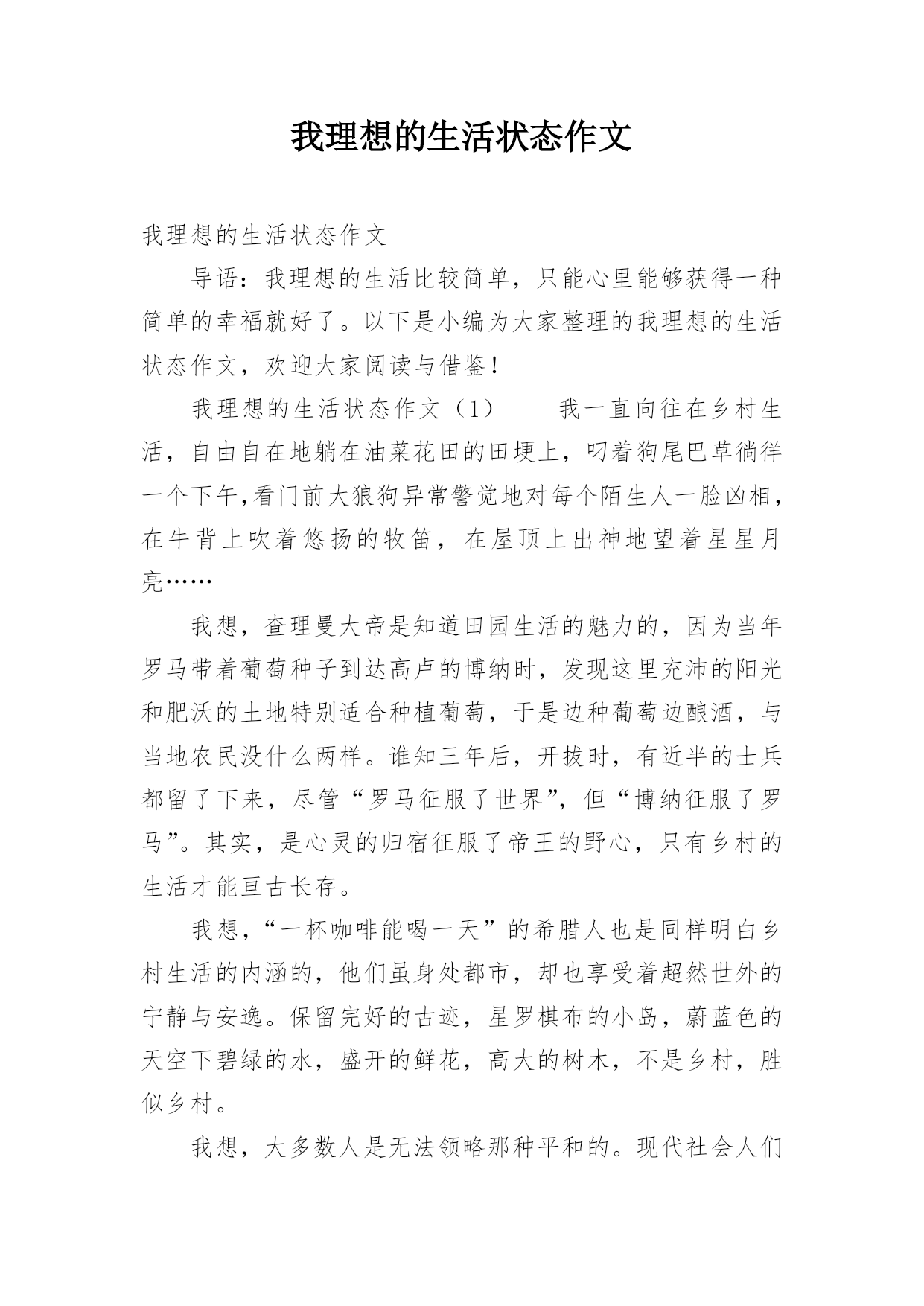 我理想的生活状态作文我理想的生活状态作文导语:我理想的生活比较简单,只能心里能够获得一种简单的幸福就好了。以下是小编为大家整理的我理想的生活状态作文,欢迎大家阅读与借鉴!我理想的生活状态作文(1)我一直向往在乡村生活,自由自在地躺在油菜花田的田埂上,叼着狗尾巴草徜徉一个下午,看门前大狼狗异常警觉地对每个陌生人一脸凶相,在牛背上吹着悠扬的牧笛,在屋顶上出神地望着星星月亮……我想,查理曼大帝是知道田园生活的魅力的,因为当年罗马带着葡萄种子到达高卢的博纳时,发现这里充沛的阳光和肥沃的土地特别适合种植葡萄,于是边