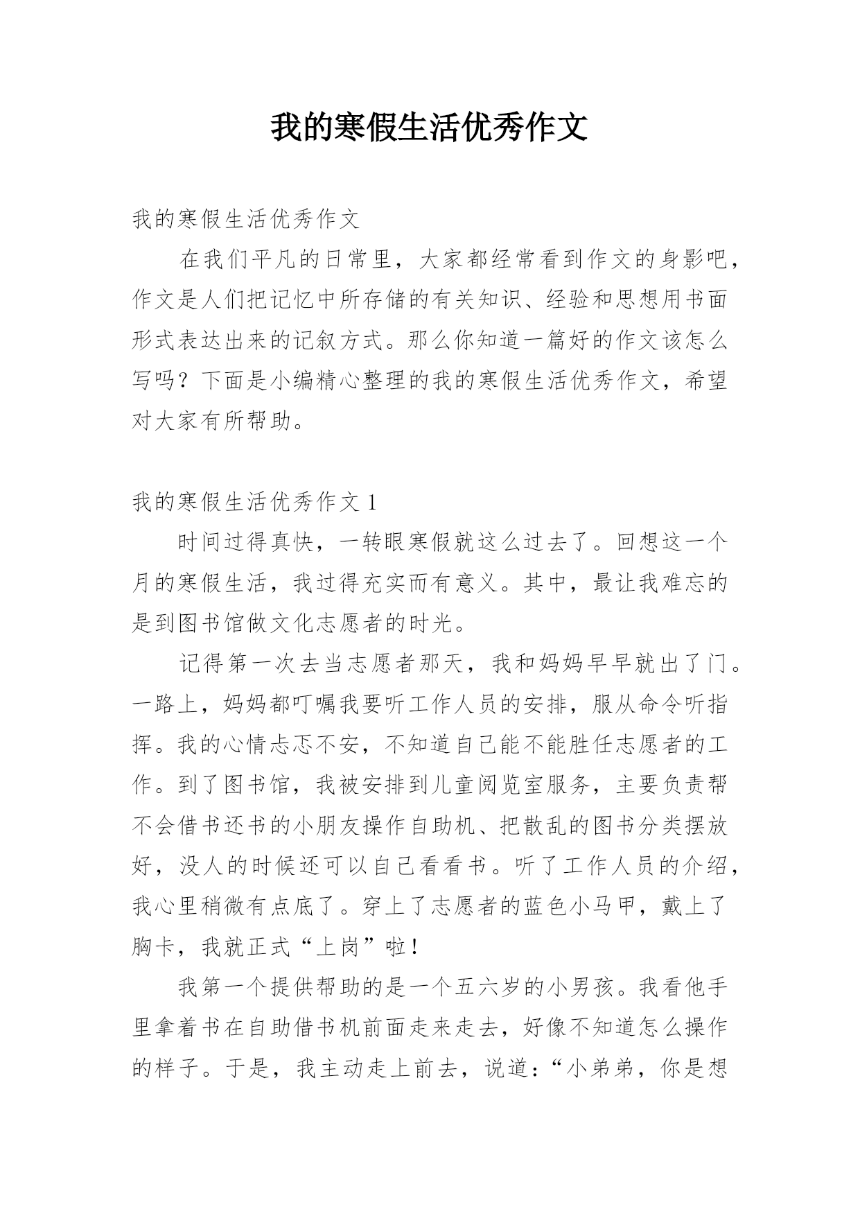 我的寒假生活优秀作文我的寒假生活优秀作文在我们平凡的日常里,大家都经常看到作文的身影吧,作文是人们把记忆中所存储的有关知识、经验和思想用书面形式表达出来的记叙方式。那么你知道一篇好的作文该怎么写吗?下面是小编精心整理的我的寒假生活优秀作文,希望对大家有所帮助。我的寒假生活优秀作文1时间过得真快,一转眼寒假就这么过去了。回想这一个月的寒假生活,我过得充实而有意义。其中,最让我难忘的是到图书馆做文化志愿者的时光。记得第一次去当志愿者那天,我和妈妈早早就出了门。一路上,妈妈都叮嘱我要听工作人员的安排,服从命令听