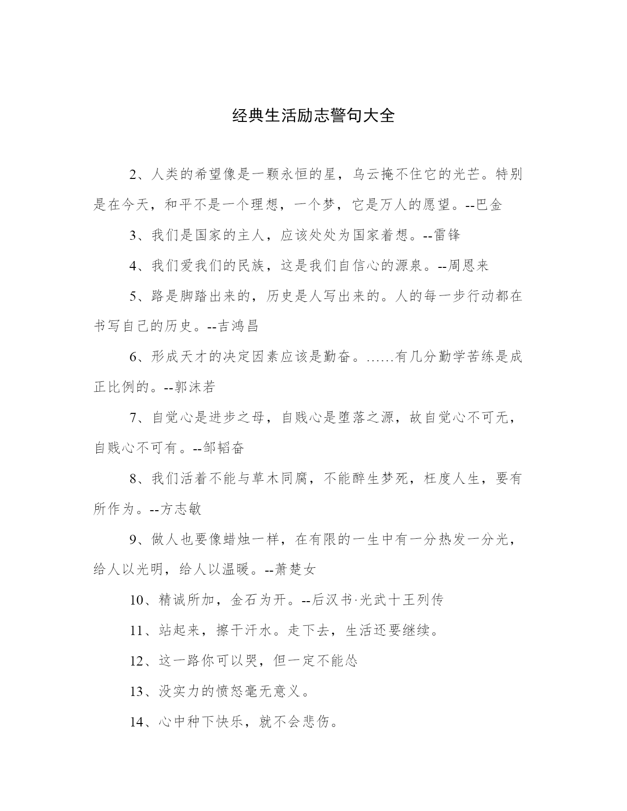 经典生活励志警句大全2、人类的希望像是一颗永恒的星,乌云掩不住它的光芒。特别是在今天,和平不是一个理想,一个梦,它是万人的愿望。--巴金3、我们是国家的主人,应该处处为国家着想。--雷锋4、我们爱我们的民族,这是我们自信心的源泉。--周恩来5、路是脚踏出来的,历史是人写出来的。人的每一步行动都在书写自己的历史。--吉鸿昌6、形成天才的决定因素应该是勤奋。……有几分勤学苦练是成正比例的。--郭沫若7、自觉心是进步之母,自贱心是堕落之源,故自觉心不可无,自贱心不可有。--邹韬奋8、我们活着不能与草木同腐,不能