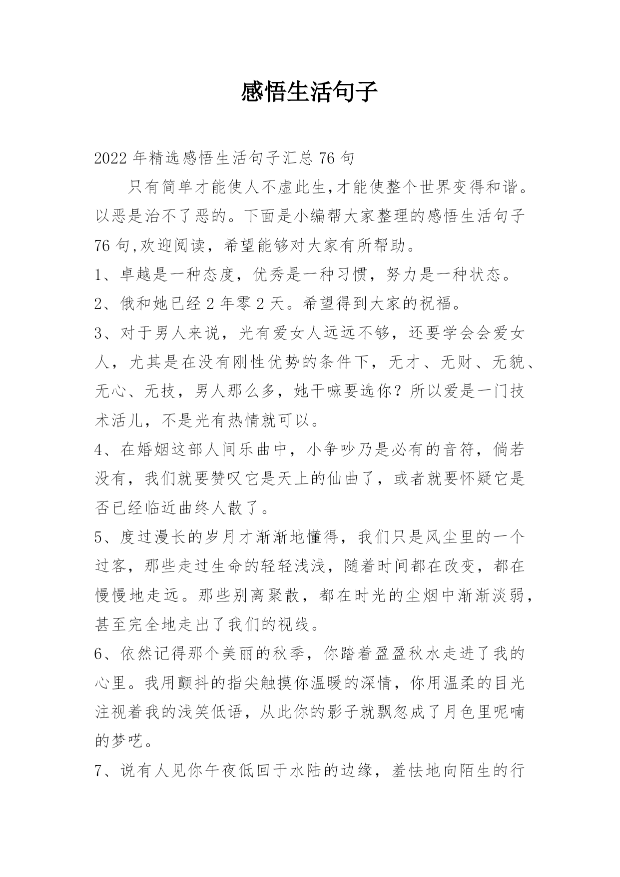感悟生活句子2022年精选感悟生活句子汇总76句只有简单才能使人不虚此生,才能使整个世界变得和谐。以恶是治不了恶的。下面是小编帮大家整理的感悟生活句子76句,欢迎阅读,希望能够对大家有所帮助。1、卓越是一种态度,优秀是一种习惯,努力是一种状态。2、俄和她已经2年零2天。希望得到大家的祝福。3、对于男人来说,光有爱女人远远不够,还要学会会爱女人,尤其是在没有刚性优势的条件下,无才、无财、无貌、无心、无技,男人那么多,她干嘛要选你?所以爱是一门技术活儿,不是光有热情就可以。4、在婚姻这部人间乐曲中,小争吵乃是