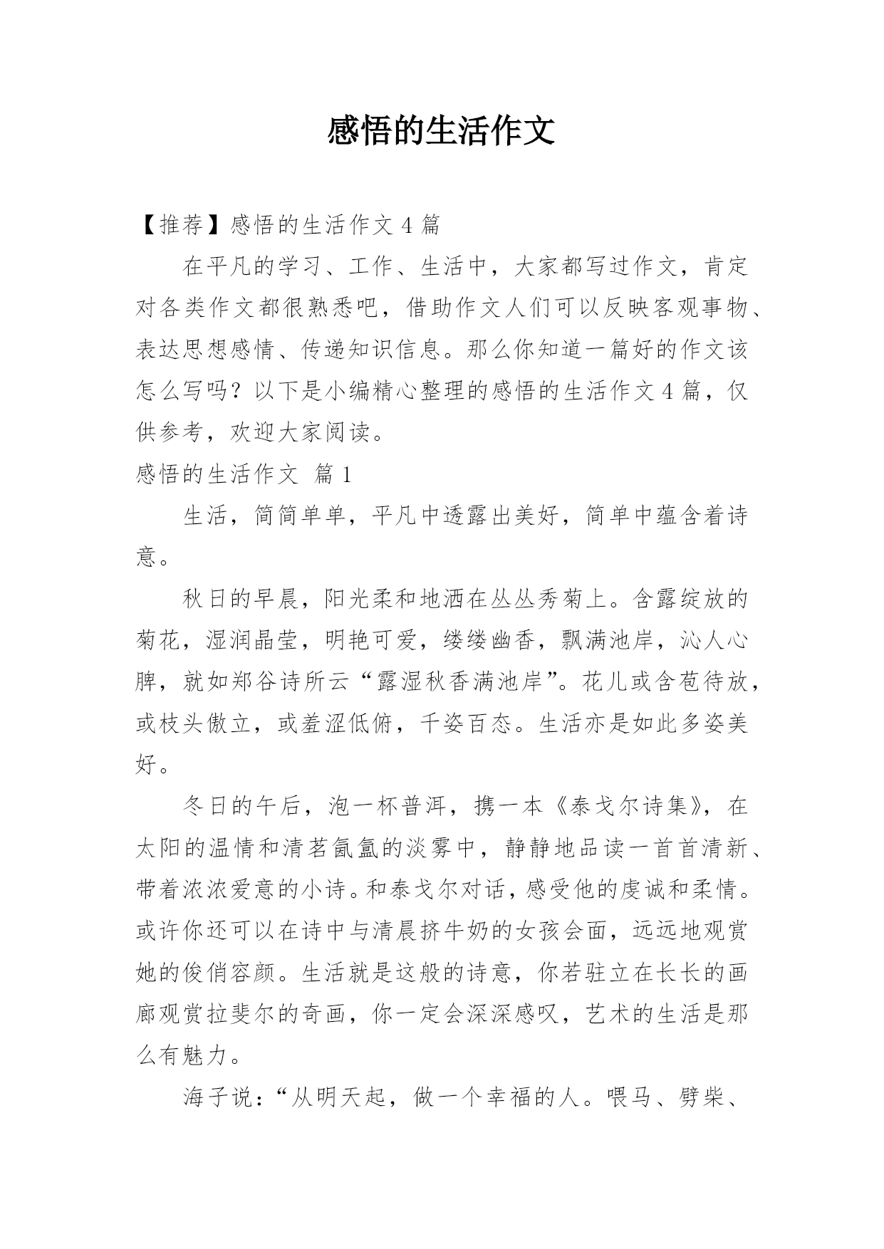 感悟的生活作文【推荐】感悟的生活作文4篇在平凡的学习、工作、生活中,大家都写过作文,肯定对各类作文都很熟悉吧,借助作文人们可以反映客观事物、表达思想感情、传递知识信息。那么你知道一篇好的作文该怎么写吗?以下是小编精心整理的感悟的生活作文4篇,仅供参考,欢迎大家阅读。感悟的生活作文篇1生活,简简单单,平凡中透露出美好,简单中蕴含着诗意。秋日的早晨,阳光柔和地洒在丛丛秀菊上。含露绽放的菊花,湿润晶莹,明艳可爱,缕缕幽香,飘满池岸,沁人心脾,就如郑谷诗所云“露湿秋香满池岸”。花儿或含苞待放,或枝头傲立,或羞涩低