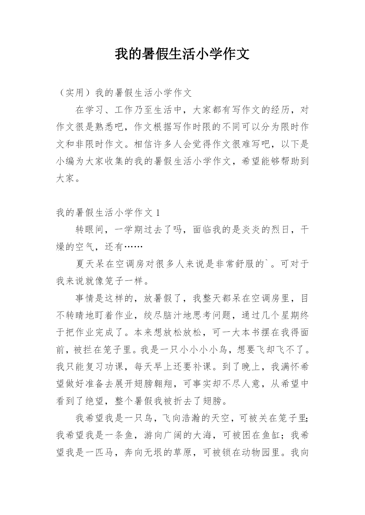 我的暑假生活小学作文(实用)我的暑假生活小学作文在学习、工作乃至生活中,大家都有写作文的经历,对作文很是熟悉吧,作文根据写作时限的不同可以分为限时作文和非限时作文。相信许多人会觉得作文很难写吧,以下是小编为大家收集的我的暑假生活小学作文,希望能够帮助到大家。我的暑假生活小学作文1转眼间,一学期过去了吗,面临我的是炎炎的烈日,干燥的空气,还有……夏天呆在空调房对很多人来说是非常舒服的`。可对于我来说就像笼子一样。事情是这样的,放暑假了,我整天都呆在空调房里,目不转睛地盯着作业,绞尽脑汁地思考问题,通过几个星