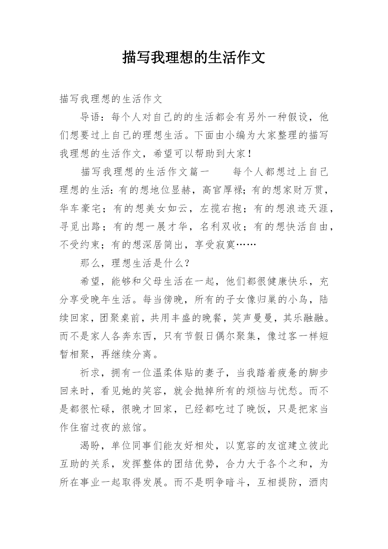 描写我理想的生活作文描写我理想的生活作文导语:每个人对自己的的生活都会有另外一种假设,他们想要过上自己的理想生活。下面由小编为大家整理的描写我理想的生活作文,希望可以帮助到大家!描写我理想的生活作文篇一每个人都想过上自己理想的生活:有的想地位显赫,高官厚禄;有的想家财万贯,华车豪宅;有的想美女如云,左揽右抱;有的想浪迹天涯,寻觅出路;有的想一展才华,名利双收;有的想快活自由,不受约束;有的想深居简出,享受寂寞……那么,理想生活是什么?希望,能够和父母生活在一起,他们都很健康快乐,充分享受晚年生活。每当傍晚