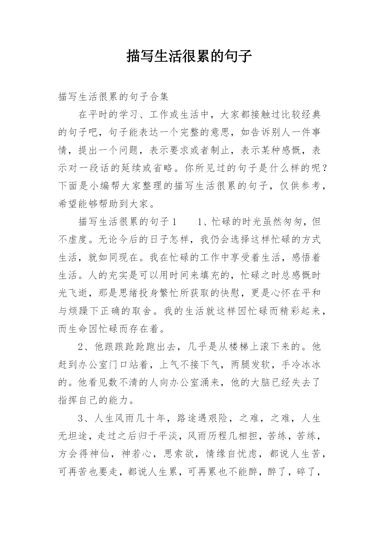 描写生活很累的句子描写生活很累的句子合集在平时的学习、工作或生活中,大家都接触过比较经典的句子吧,句子能表达一个完整的意思,如告诉别人一件事情,提出一个问题,表示要求或者制止,表示某种感慨,表示对一段话的延续或省略。你所见过的句子是什么样的呢?下面是小编帮大家整理的描写生活很累的句子,仅供参考,希望能够帮助到大家。描写生活很累的句子11、忙碌的时光虽然匆匆,但不虚度。无论今后的日子怎样,我仍会选择这样忙碌的方式生活,就如同现在。我在忙碌的工作中享受着生活,感悟着生活。人的充实是可以用时间来填充的,忙碌之时