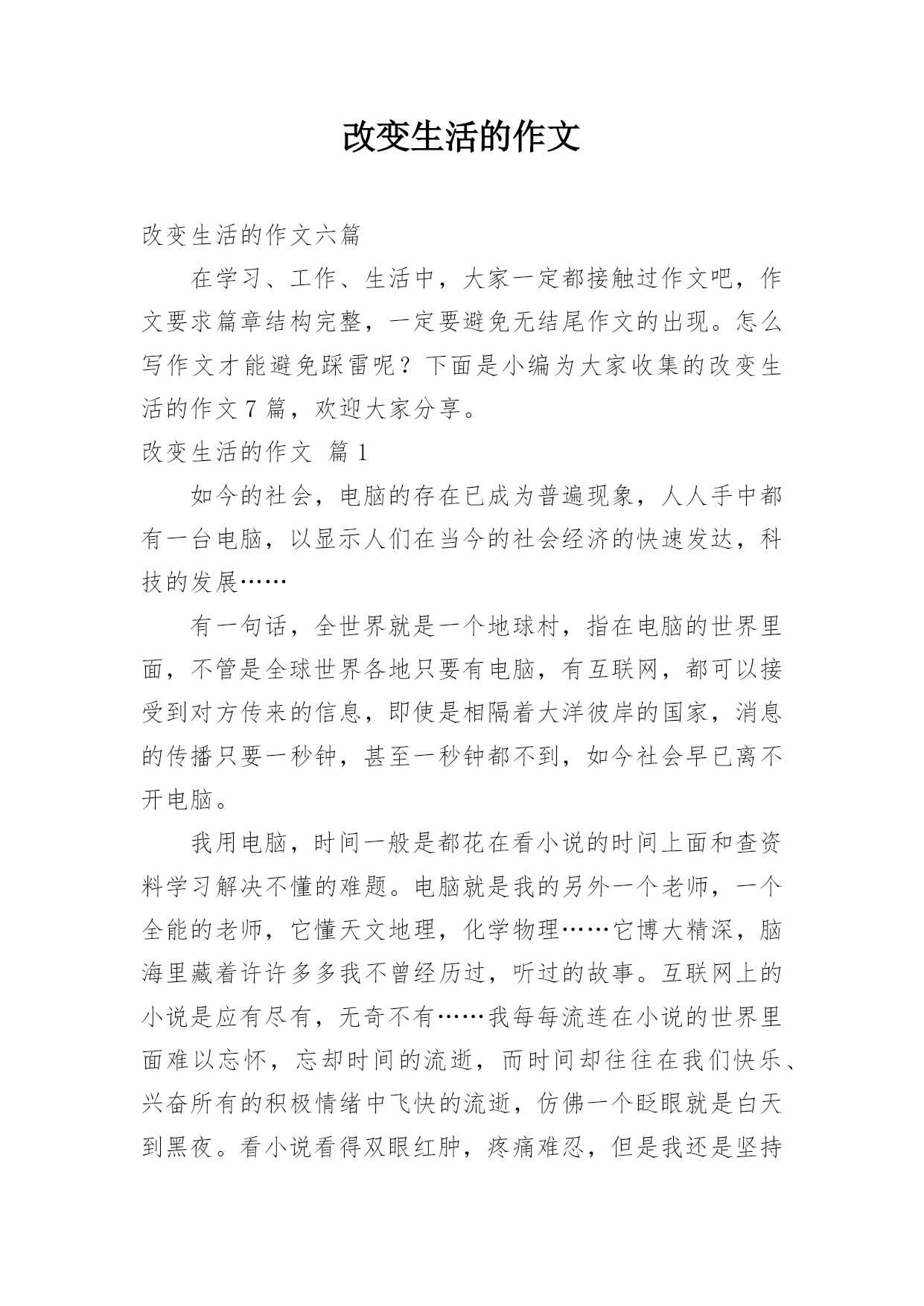 改变生活的作文改变生活的作文六篇在学习、工作、生活中,大家一定都接触过作文吧,作文要求篇章结构完整,一定要避免无结尾作文的出现。怎么写作文才能避免踩雷呢?下面是小编为大家收集的改变生活的作文7篇,欢迎大家分享。改变生活的作文篇1如今的社会,电脑的存在已成为普遍现象,人人手中都有一台电脑,以显示人们在当今的社会经济的快速发达,科技的发展……有一句话,全世界就是一个地球村,指在电脑的世界里面,不管是全球世界各地只要有电脑,有互联网,都可以接受到对方传来的信息,即使是相隔着大洋彼岸的国家,消息的传播只要一秒钟,