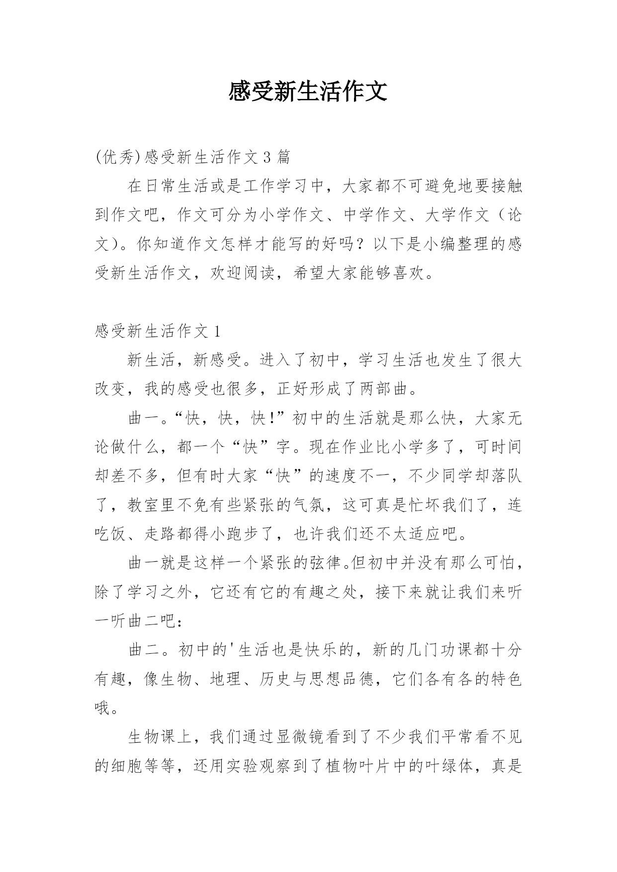 感受新生活作文(优秀)感受新生活作文3篇在日常生活或是工作学习中,大家都不可避免地要接触到作文吧,作文可分为小学作文、中学作文、大学作文(论文)。你知道作文怎样才能写的好吗?以下是小编整理的感受新生活作文,欢迎阅读,希望大家能够喜欢。感受新生活作文1新生活,新感受。进入了初中,学习生活也发生了很大改变,我的感受也很多,正好形成了两部曲。曲一。“快,快,快!”初中的生活就是那么快,大家无论做什么,都一个“快”字。现在作业比小学多了,可时间却差不多,但有时大家“快”的速度不一,不少同学却落队了,教室里不免有些