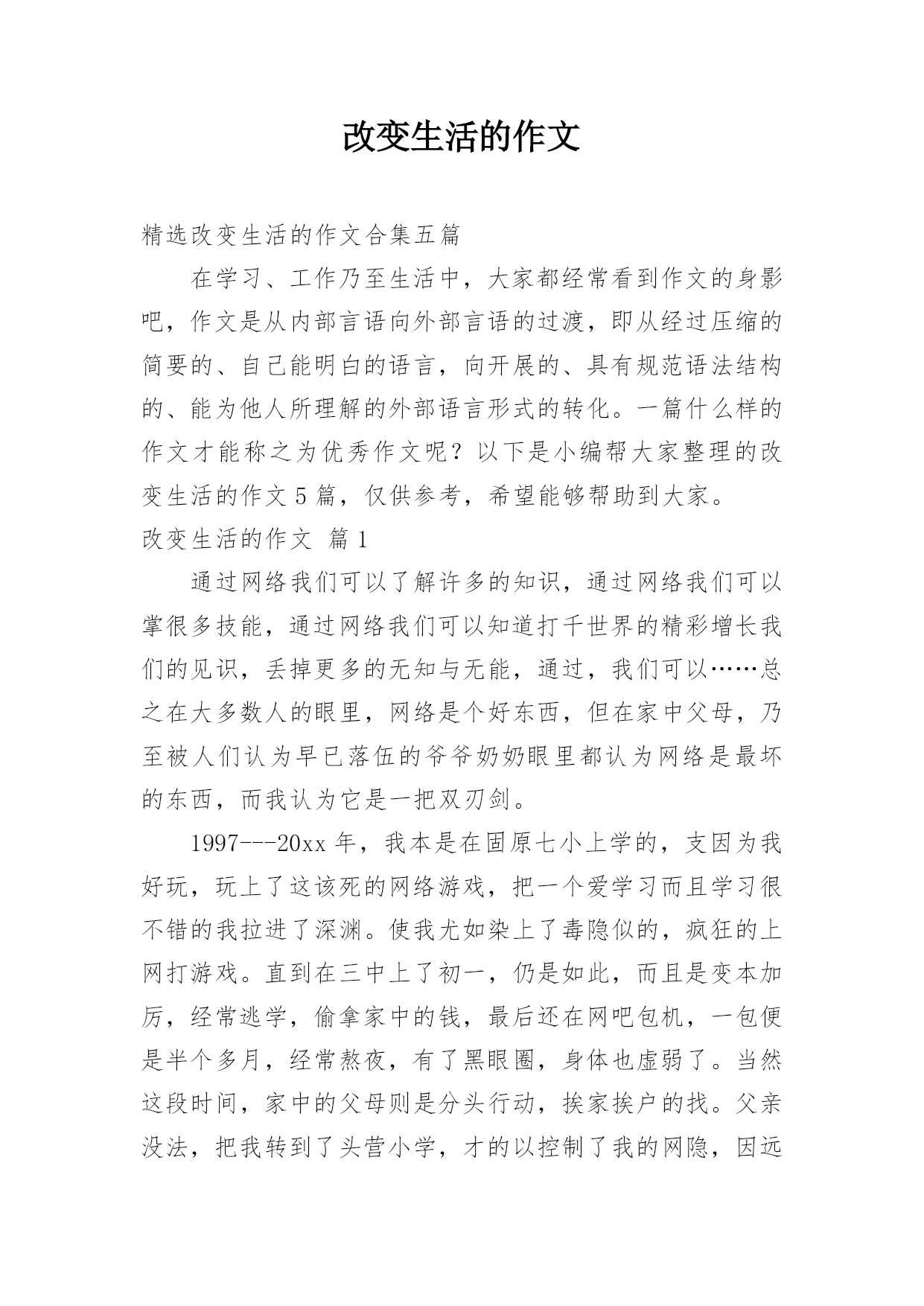改变生活的作文精选改变生活的作文合集五篇在学习、工作乃至生活中,大家都经常看到作文的身影吧,作文是从内部言语向外部言语的过渡,即从经过压缩的简要的、自己能明白的语言,向开展的、具有规范语法结构的、能为他人所理解的外部语言形式的转化。一篇什么样的作文才能称之为优秀作文呢?以下是小编帮大家整理的改变生活的作文5篇,仅供参考,希望能够帮助到大家。改变生活的作文篇1通过网络我们可以了解许多的知识,通过网络我们可以掌很多技能,通过网络我们可以知道打千世界的精彩增长我们的见识,丢掉更多的无知与无能,通过,我们可以……