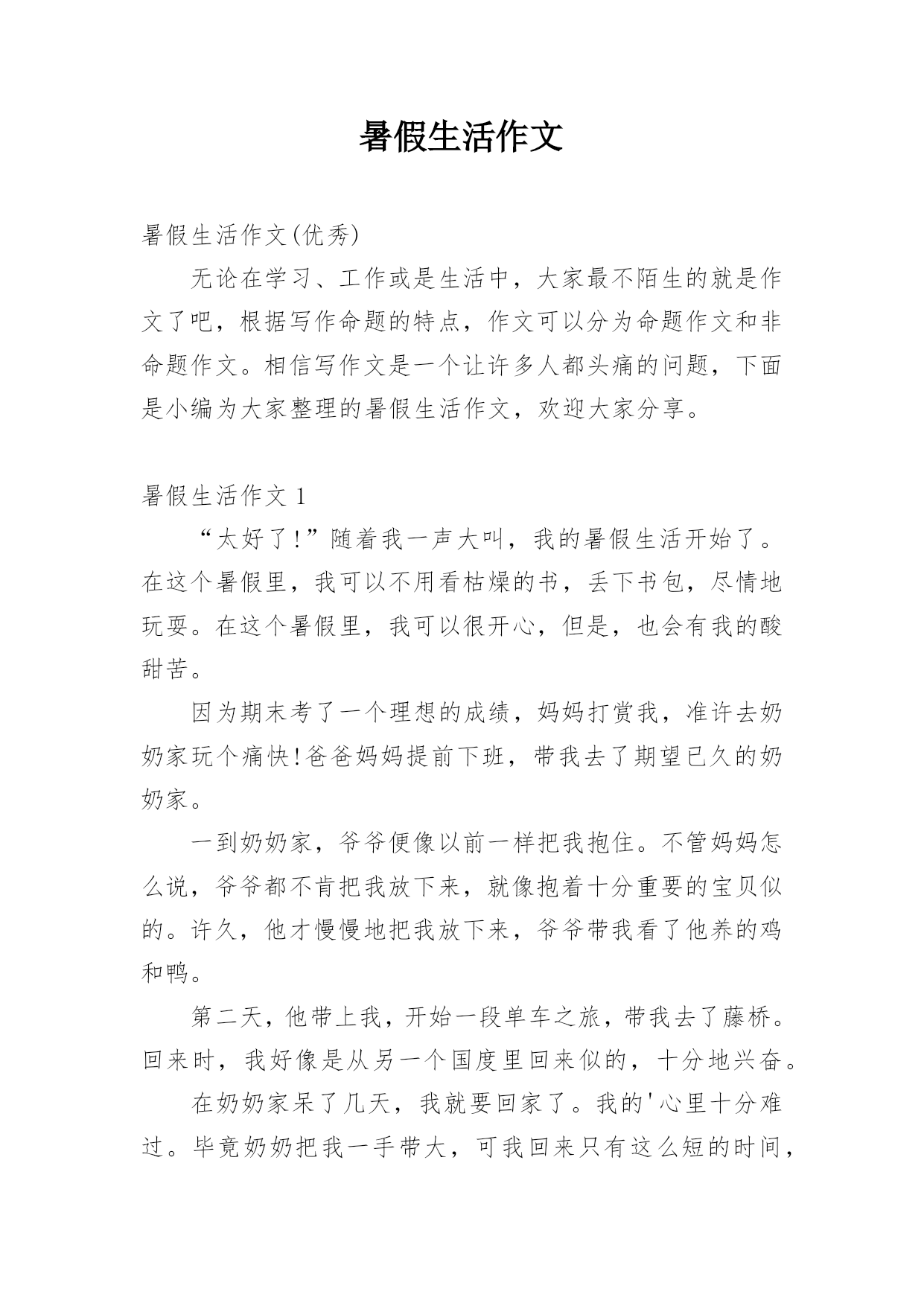 暑假生活作文暑假生活作文(优秀)无论在学习、工作或是生活中,大家最不陌生的就是作文了吧,根据写作命题的特点,作文可以分为命题作文和非命题作文。相信写作文是一个让许多人都头痛的问题,下面是小编为大家整理的暑假生活作文,欢迎大家分享。暑假生活作文1“太好了!”随着我一声大叫,我的暑假生活开始了。在这个暑假里,我可以不用看枯燥的书,丢下书包,尽情地玩耍。在这个暑假里,我可以很开心,但是,也会有我的酸甜苦。因为期末考了一个理想的成绩,妈妈打赏我,准许去奶奶家玩个痛快!爸爸妈妈提前下班,带我去了期望已久的奶奶家。一