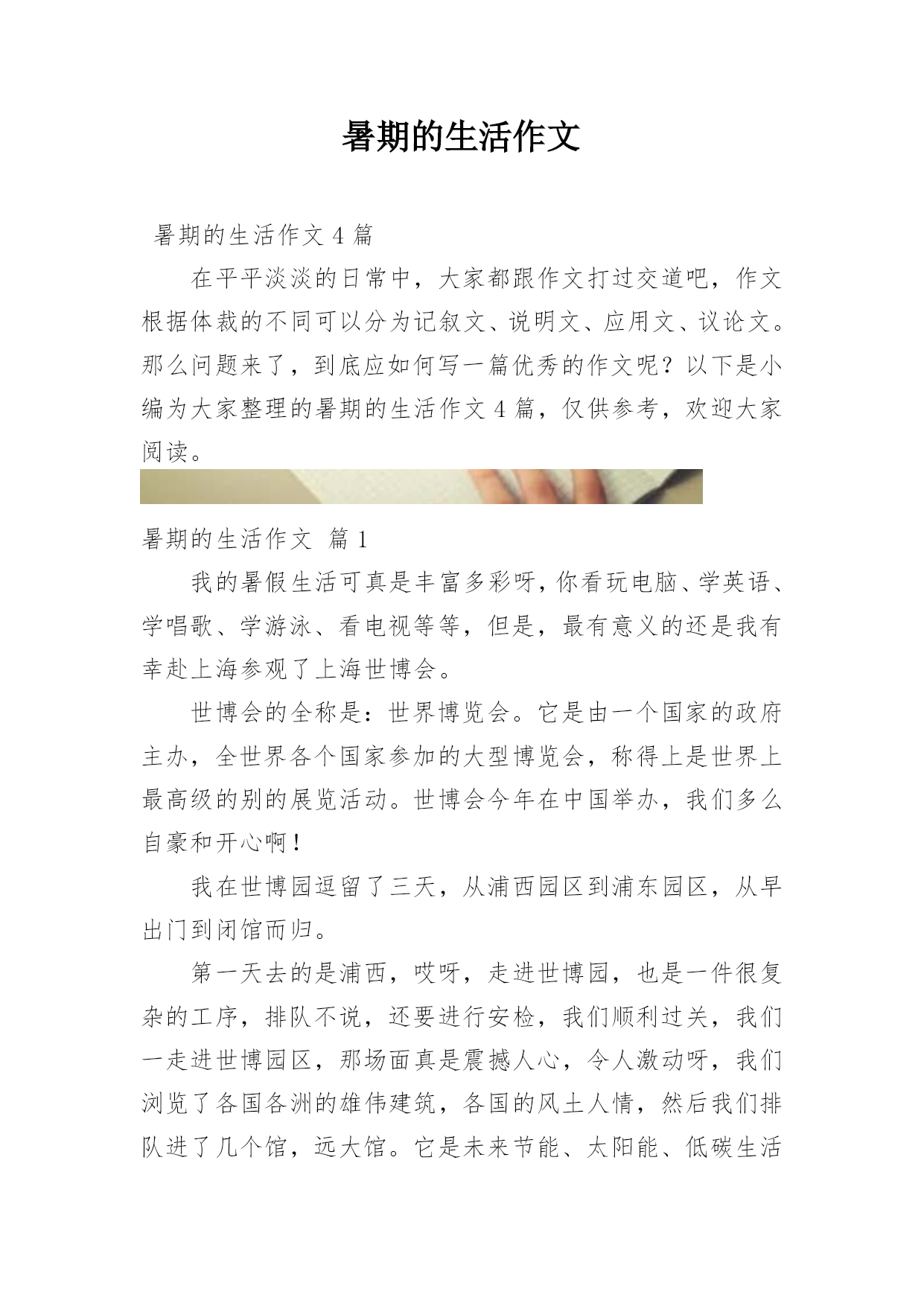 暑期的生活作文暑期的生活作文4篇在平平淡淡的日常中,大家都跟作文打过交道吧,作文根据体裁的不同可以分为记叙文、说明文、应用文、议论文。那么问题来了,到底应如何写一篇优秀的作文呢?以下是小编为大家整理的暑期的生活作文4篇,仅供参考,欢迎大家阅读。暑期的生活作文篇1我的暑假生活可真是丰富多彩呀,你看玩电脑、学英语、学唱歌、学游泳、看电视等等,但是,最有意义的还是我有幸赴上海参观了上海世博会。世博会的全称是:世界博览会。它是由一个国家的政府主办,全世界各个国家参加的大型博览会,称得上是世界上最高级的别的展览活动