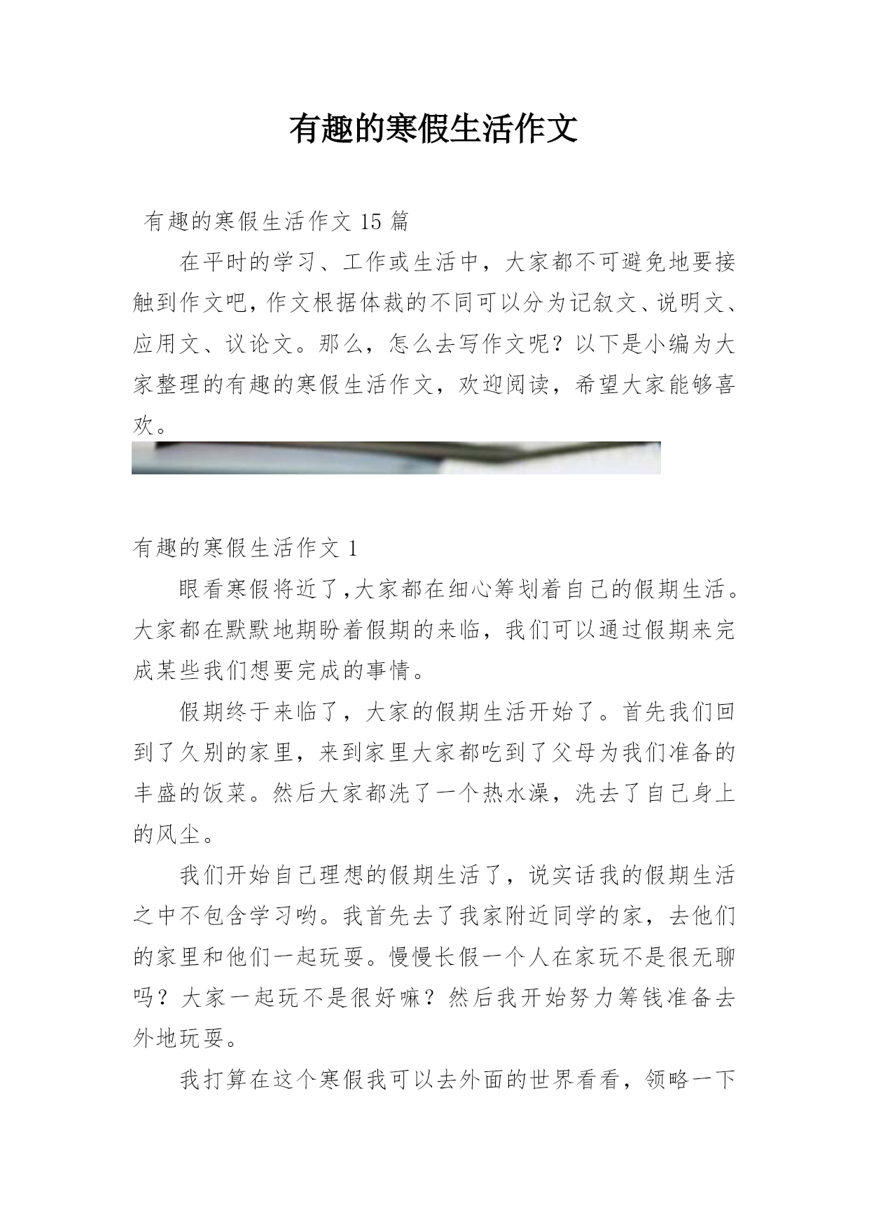 有趣的寒假生活作文有趣的寒假生活作文15篇在平时的学习、工作或生活中,大家都不可避免地要接触到作文吧,作文根据体裁的不同可以分为记叙文、说明文、应用文、议论文。那么,怎么去写作文呢?以下是小编为大家整理的有趣的寒假生活作文,欢迎阅读,希望大家能够喜欢。有趣的寒假生活作文1眼看寒假将近了,大家都在细心筹划着自己的假期生活。大家都在默默地期盼着假期的来临,我们可以通过假期来完成某些我们想要完成的事情。假期终于来临了,大家的假期生活开始了。首先我们回到了久别的家里,来到家里大家都吃到了父母为我们准备的丰盛的饭菜