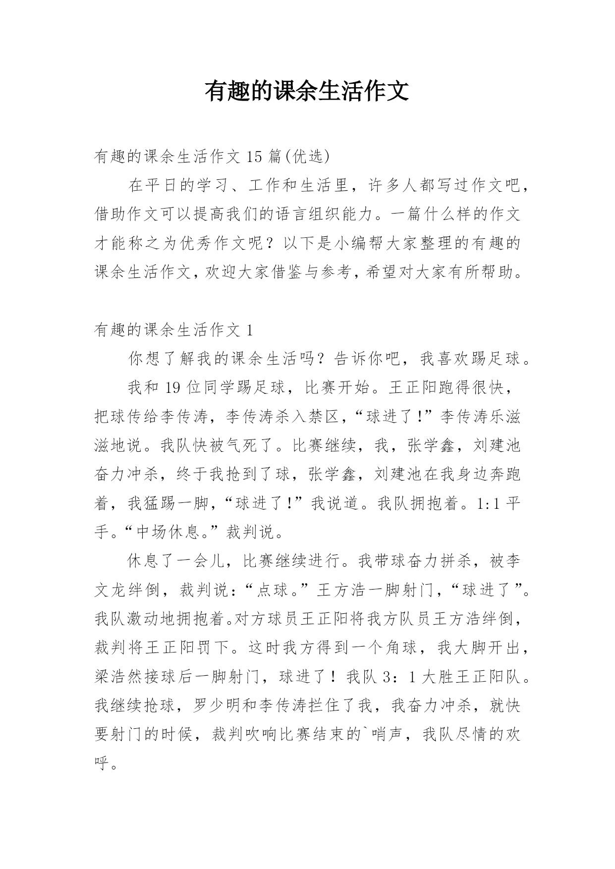 有趣的课余生活作文有趣的课余生活作文15篇(优选)在平日的学习、工作和生活里,许多人都写过作文吧,借助作文可以提高我们的语言组织能力。一篇什么样的作文才能称之为优秀作文呢?以下是小编帮大家整理的有趣的课余生活作文,欢迎大家借鉴与参考,希望对大家有所帮助。有趣的课余生活作文1你想了解我的课余生活吗?告诉你吧,我喜欢踢足球。我和19位同学踢足球,比赛开始。王正阳跑得很快,把球传给李传涛,李传涛杀入禁区,“球进了!”李传涛乐滋滋地说。我队快被气死了。比赛继续,我,张学鑫,刘建池奋力冲杀,终于我抢到了球,张学鑫,