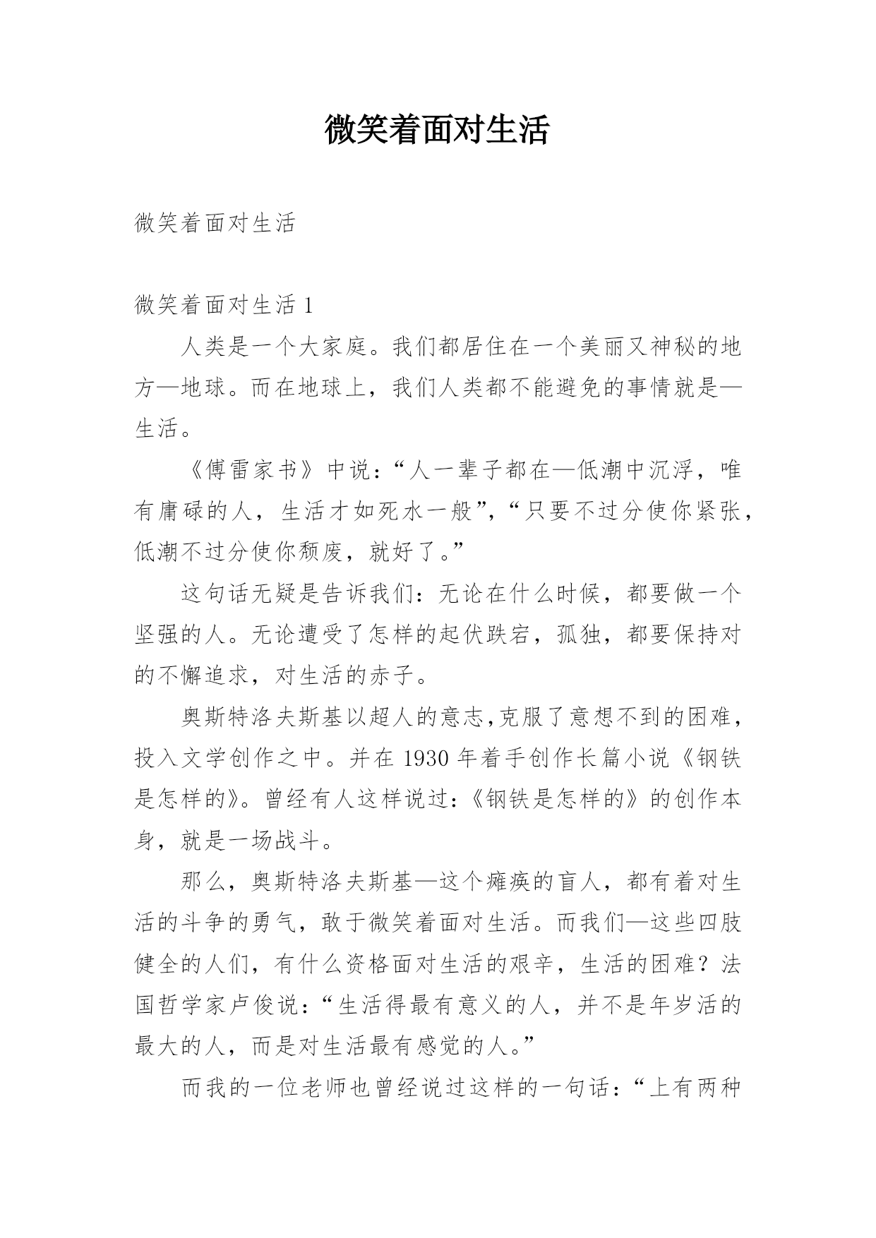 微笑着面对生活微笑着面对生活微笑着面对生活1人类是一个大家庭。我们都居住在一个美丽又神秘的地方—地球。而在地球上,我们人类都不能避免的事情就是—生活。《傅雷家书》中说:“人一辈子都在—低潮中沉浮,唯有庸碌的人,生活才如死水一般”,“只要不过分使你紧张,低潮不过分使你颓废,就好了。”这句话无疑是告诉我们:无论在什么时候,都要做一个坚强的人。无论遭受了怎样的起伏跌宕,孤独,都要保持对的不懈追求,对生活的赤子。奥斯特洛夫斯基以超人的意志,克服了意想不到的困难,投入文学创作之中。并在1930年着手创作长篇小说《钢